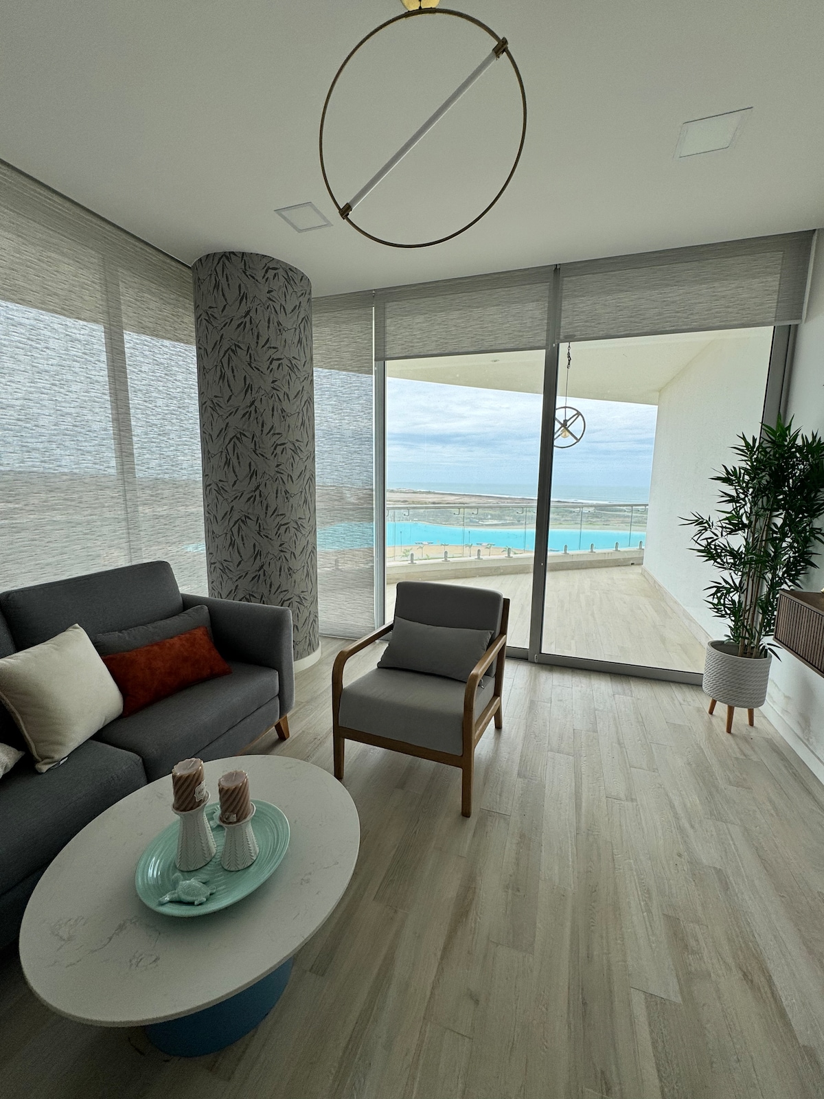 Lujoso departamento ubicado en la Torre Atlantic dentro del complejo inmobiliario Ocean Club - Sunset City. Podrá disfrutar de un ambiente cómodo, seguro, con estacionamiento gratuito, acceso a la playa pública y al área social del edificio. Es un lugar ideal para compartir en pareja, con familia y/o amigos. Además, cuenta con un espacio específicamente diseñado para teletrabajo o clases online. *El uso de las instalaciones del Ocean Club es únicamente para sus socios.