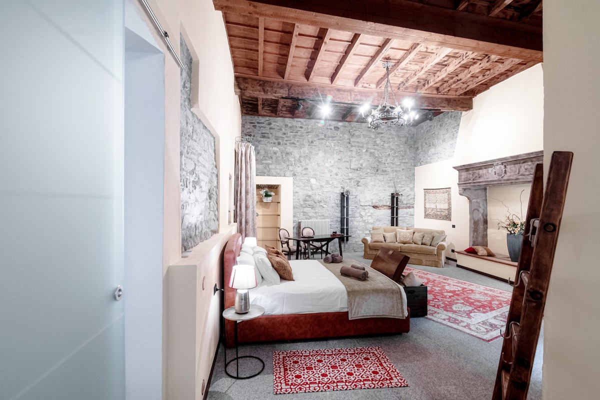 Suite located on the second floor overlooking the 15th-century Italian garden. On the lower level there is a cozy sitting room while on the upper level there is the bedroom with a comfortable double bed, the wardrobe and the bathroom with separate bathtub and shower.