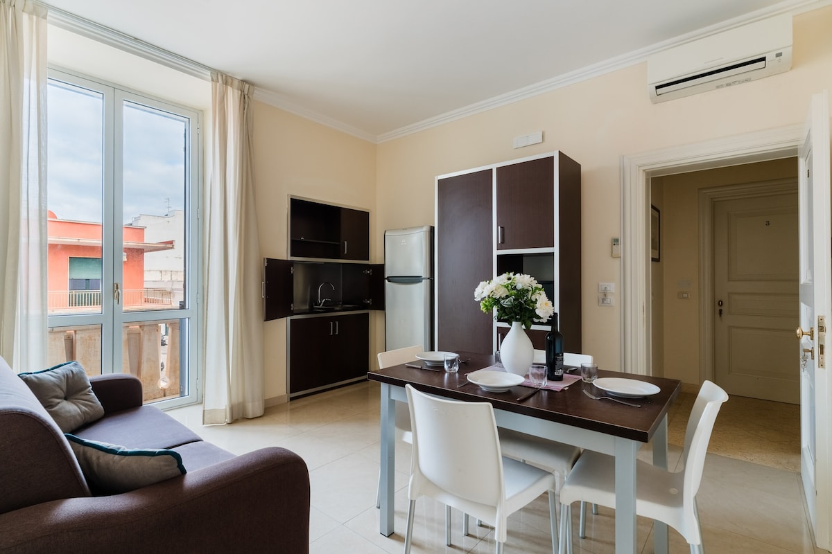 Apartment hotel Unit 1 in Gallipoli offers 55 sqm of space for up to 4 guests. You have 1 bedroom, 1 living room, and 1 bathroom during your stay. A well-equipped private kitchen is available for your convenience. Amenities include high-speed WiFi suitable for video calls and a television for your entertainment. Palazzo Mongiò in Gallipoli is located in the center of town near the beach.