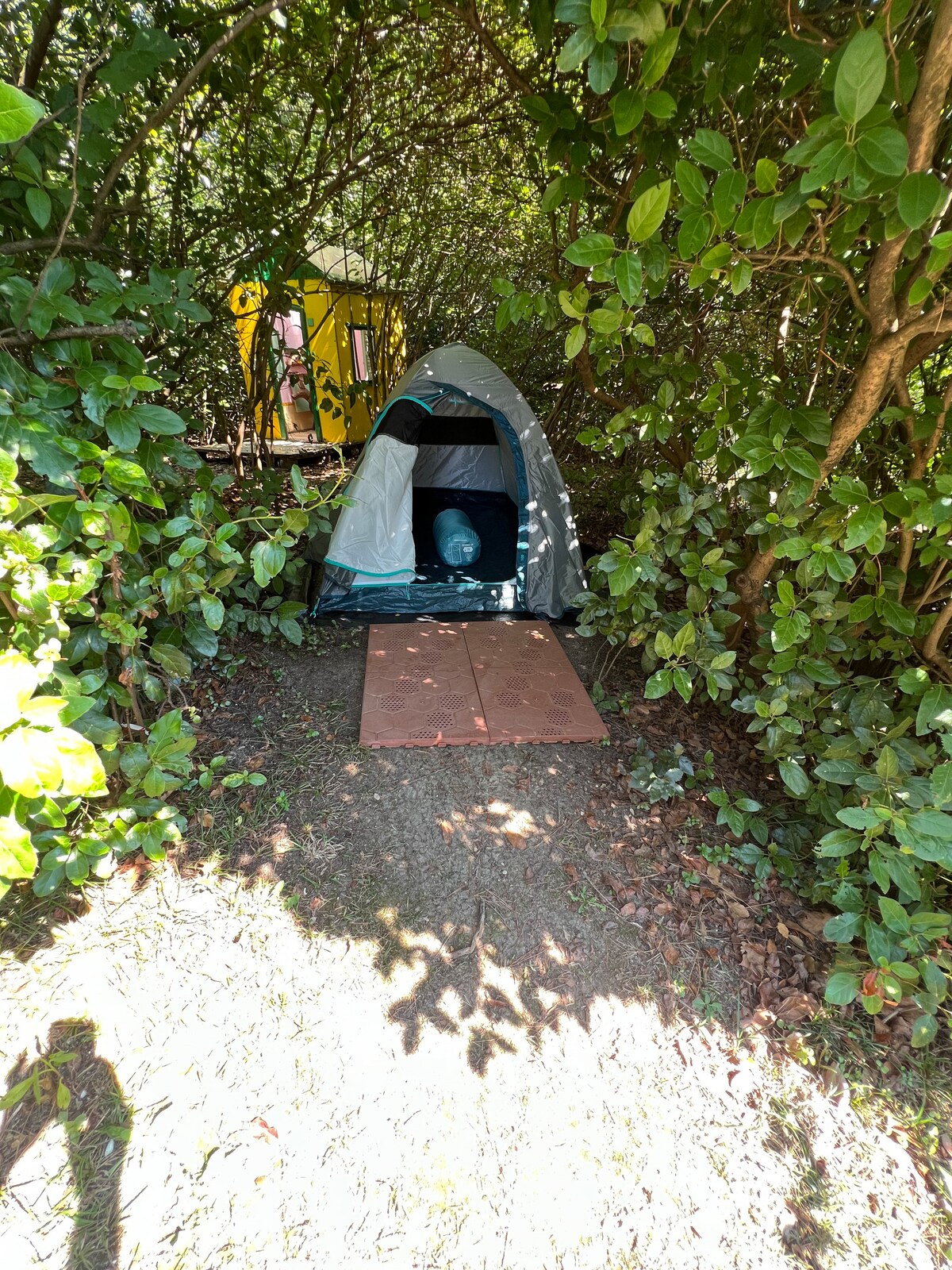 在綠地區內,有一個空間是為想在帳篷裡睡覺的人保留的,讓他們享受沉浸在大自然中的獨特體驗。 營地的房客可使用:電力服務、兩間附淋浴間的獨立衛浴、配備所有用具的公共廚房、烤肉設備和飲用泉水噴泉。 若要享受此體驗,您可以使用您的帳篷,如有必要,也可以選擇租用我們的床墊和睡袋。
