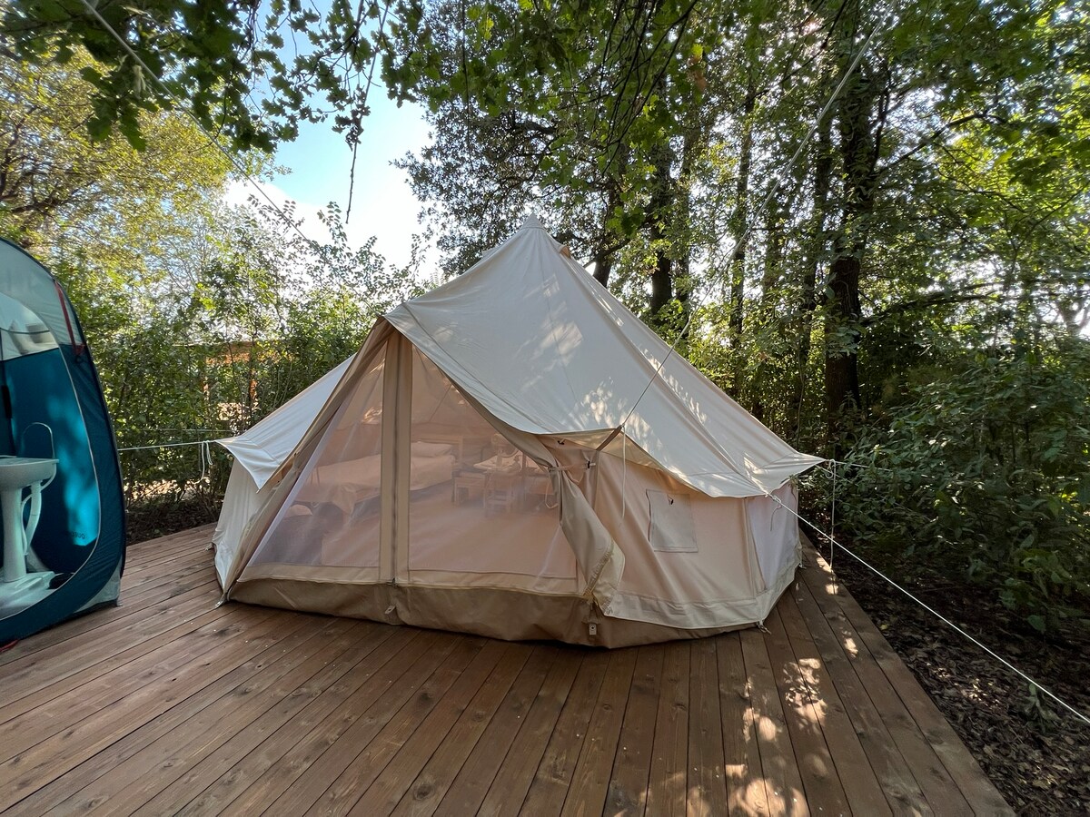 Houd je van kamperen, maar dan wel in stijl en zonder het gesleep met spullen? We hebben twee ingerichte 2-persoons bell tenten op ons landgoed. De ene tent staat midden in de olijfgaard, met veel privacy en een adembenemend uitzicht. De tweede tent staat wat dichter bij de andere gasten. In onze woonboerderij bevinden zich een gemeenschappelijke koelkast, de sanitaire voorzieningen en douches.