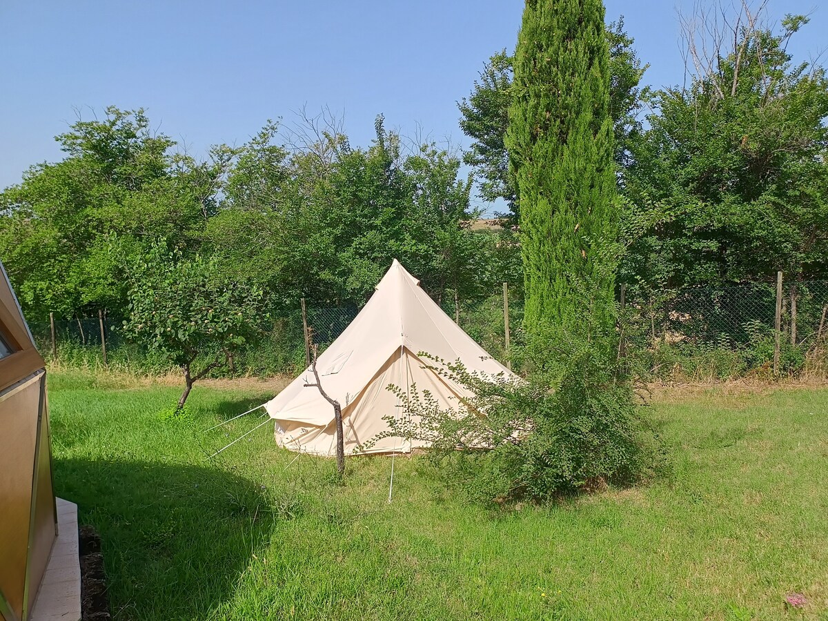 我們寬敞的野營帳篷可欣賞山谷的美景,並根據「豪華露營」原則,配備了自己的衛生設施、完整的廚房、3間臥室,起居空間不少於50平方公尺! 從您的野營帳篷,您可以步行穿過橄欖樹林進入我們的花園,您可以使用我們的游泳池和我們房源的所有其他設施。 我們位於Le Marche地區,靠近風景如畫的Treia鎮。