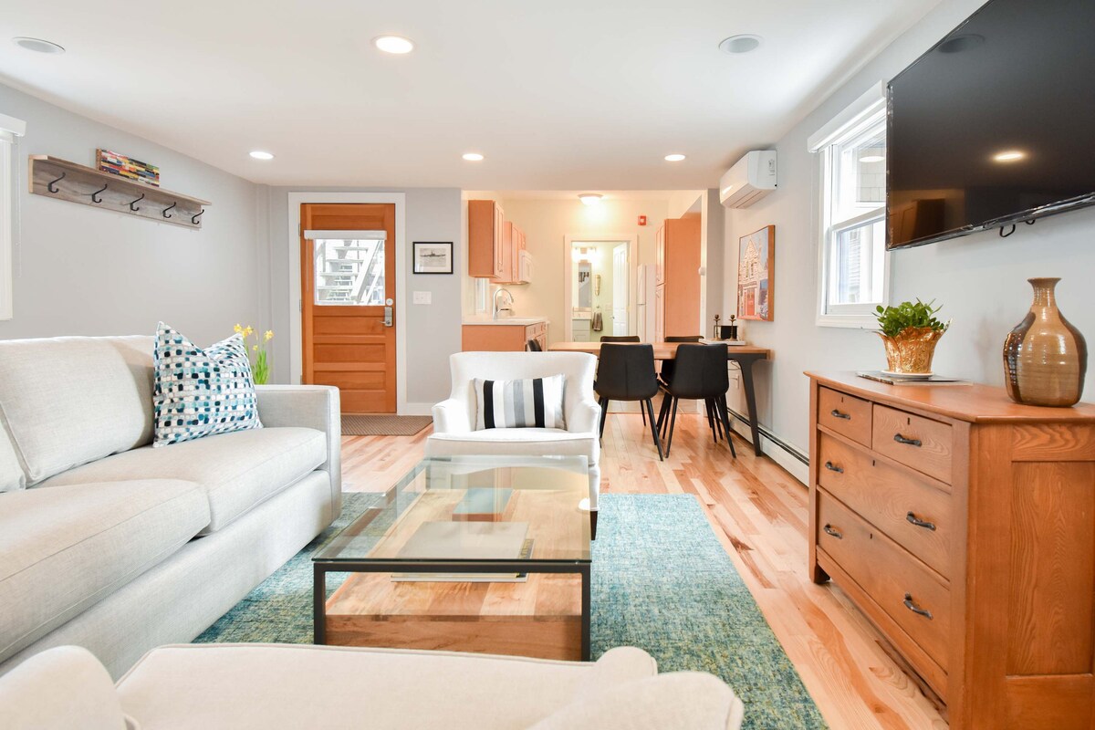 Pristine 2 bedroom condo with open kitchen/living area, indoor fireplace, central A/C, private outdoor patio with grill & washer/dryer. Nestled in PRIME location on Arch St. between Commercial & Bradford St. Includes 1 parking spot* for the guest right on the premises! Condo has been newly renovated - new kitchen, paint & furniture! *The assigned parking spot will fit any small to mid-sized vehicle. If you have a large vehicle that is long in length (for example a pick up truck), it may not fit.