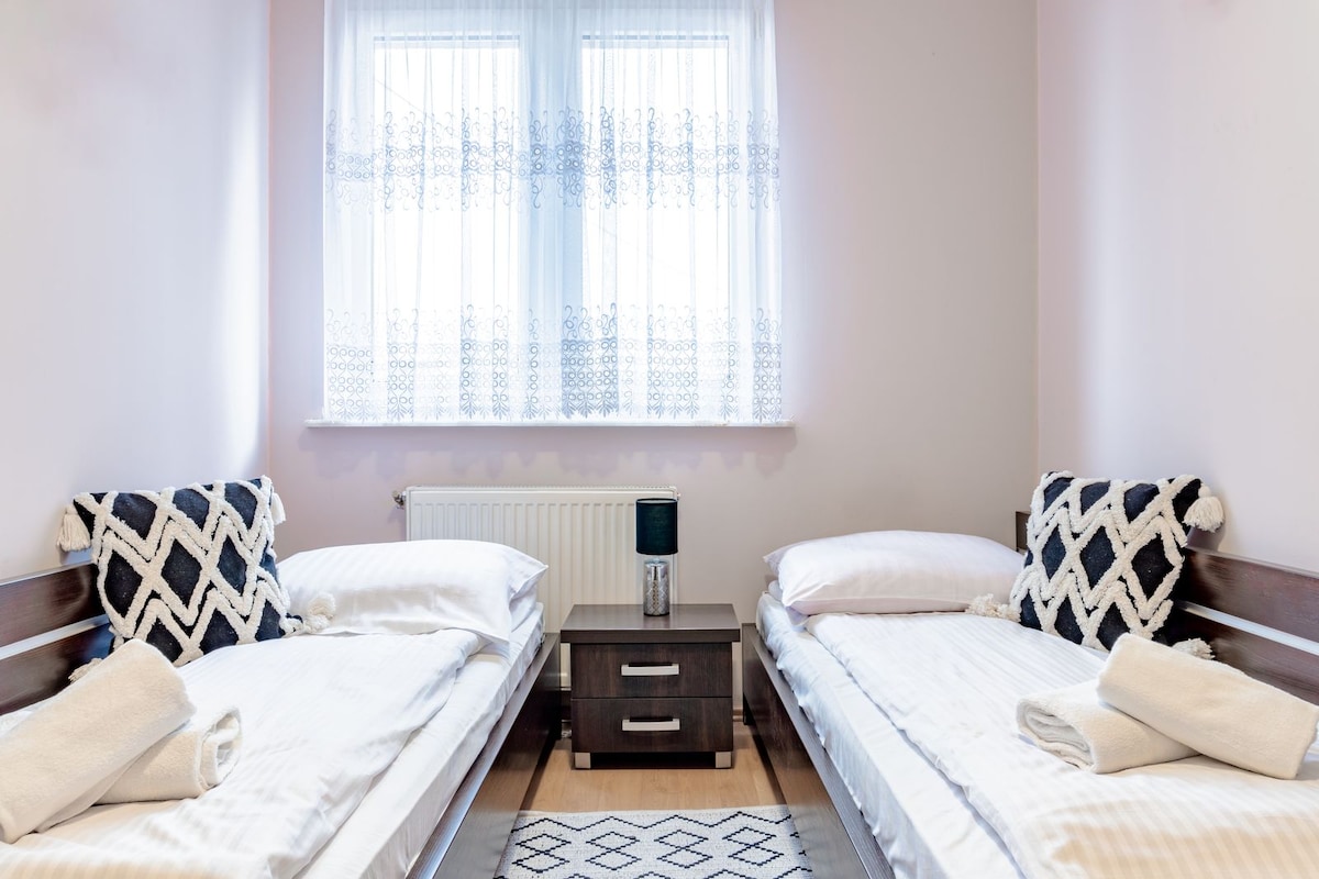 此公寓屬於獨家✯Renters Prestige✯精選。 對於最苛刻的房客來說,★★★★★飯店已知的一系列設備與服務在等著您。 選擇我們公寓的原因: ★ 輕鬆自助入住和退房 ★ 很好的位置,靠近湖泊 距離淺湖岸★120公尺 距離★海灘僅5公裏 ★ 2間臥室和桑拿房 配有花園家具的★露臺 ★ 電視和Netflix ★ 設備齊全的小廚房 ★ 洗漱用品、毛巾、牀上用品 ★ 增值稅發票(應要求提供)