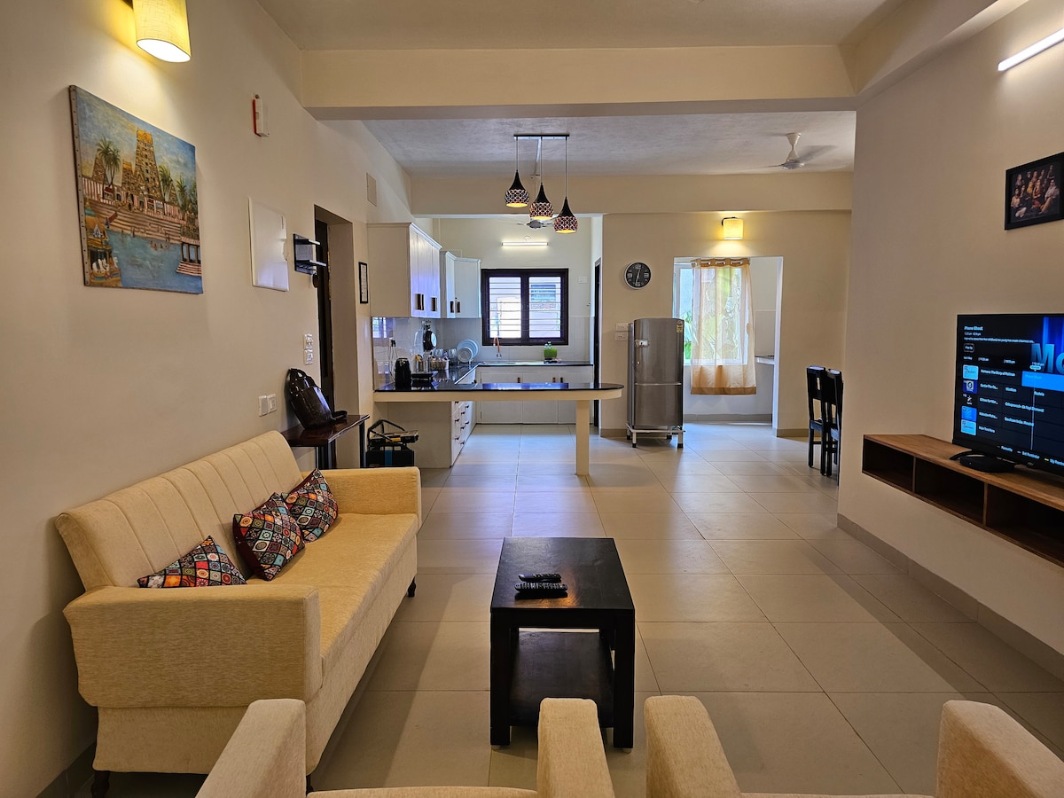 您在奧羅維爾的家外之家裝潢精美,以Chettinad為主題。 我們房源的每個角落都適合Instagram ,室內裝潢多彩、kolam藝術、古董裝飾等。 1BHK最多可容納4人,客廳配有秋千牀和沙發牀。附近有很多餐廳,我們的廚房配備了精心設備,可滿足您的所有需求-無論是快速製作煎蛋卷還是全套印度美食。 因此,您可以坐下來放鬆,品嚐咖啡。