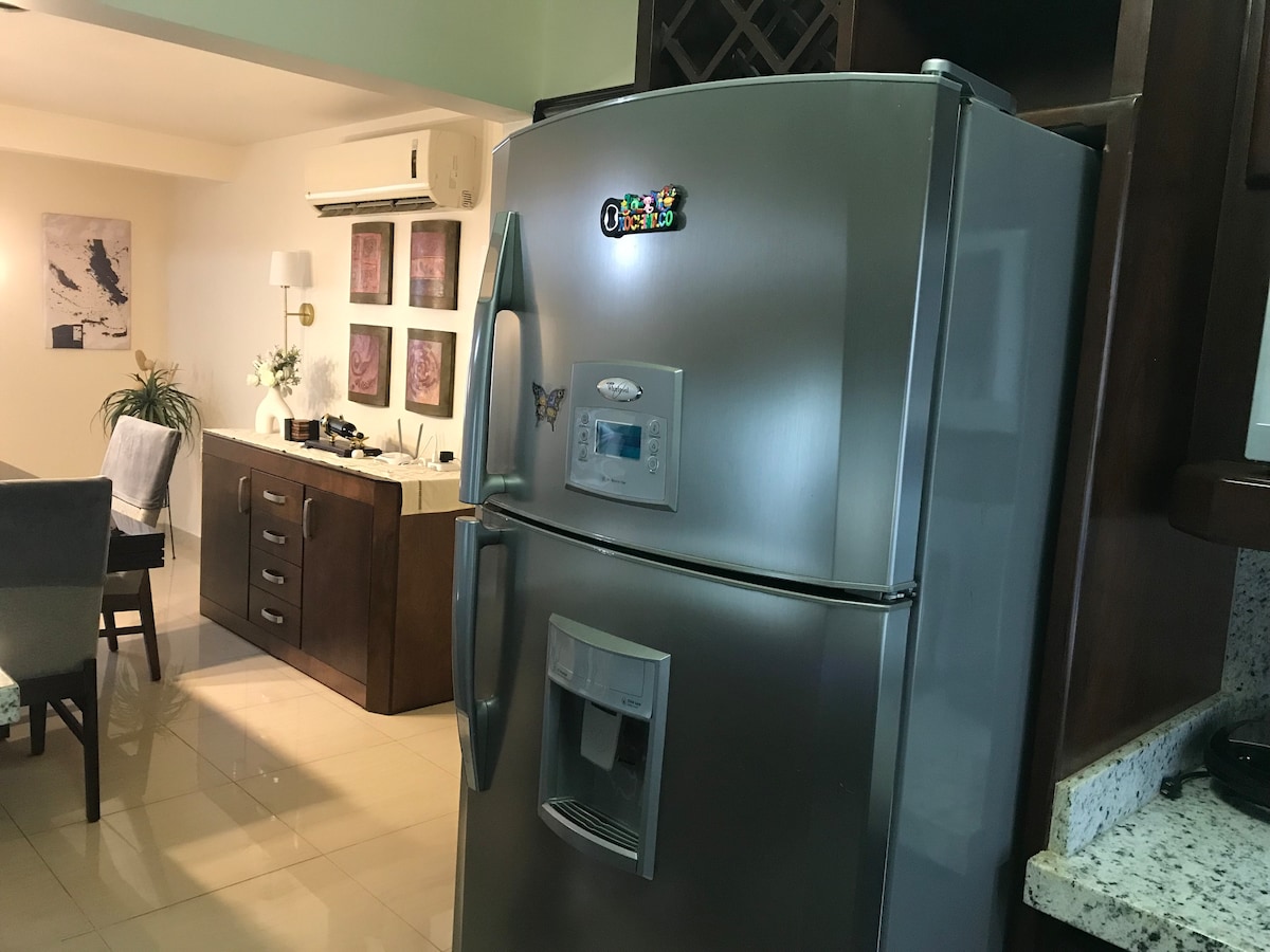 全新且美麗的公寓,非常適合 2 人入住。配備優質的網路,讓您住得舒適。它有配備電動門(僅限小型車輛)的停車位,以及照明和安全攝影機。 它位於市中心,距離 IMSS、總醫院、圖圖利廣場和戈雅廣場僅幾分鐘路程。公寓配有智慧鎖,因此我們會在您抵達當天發送門禁密碼給您。