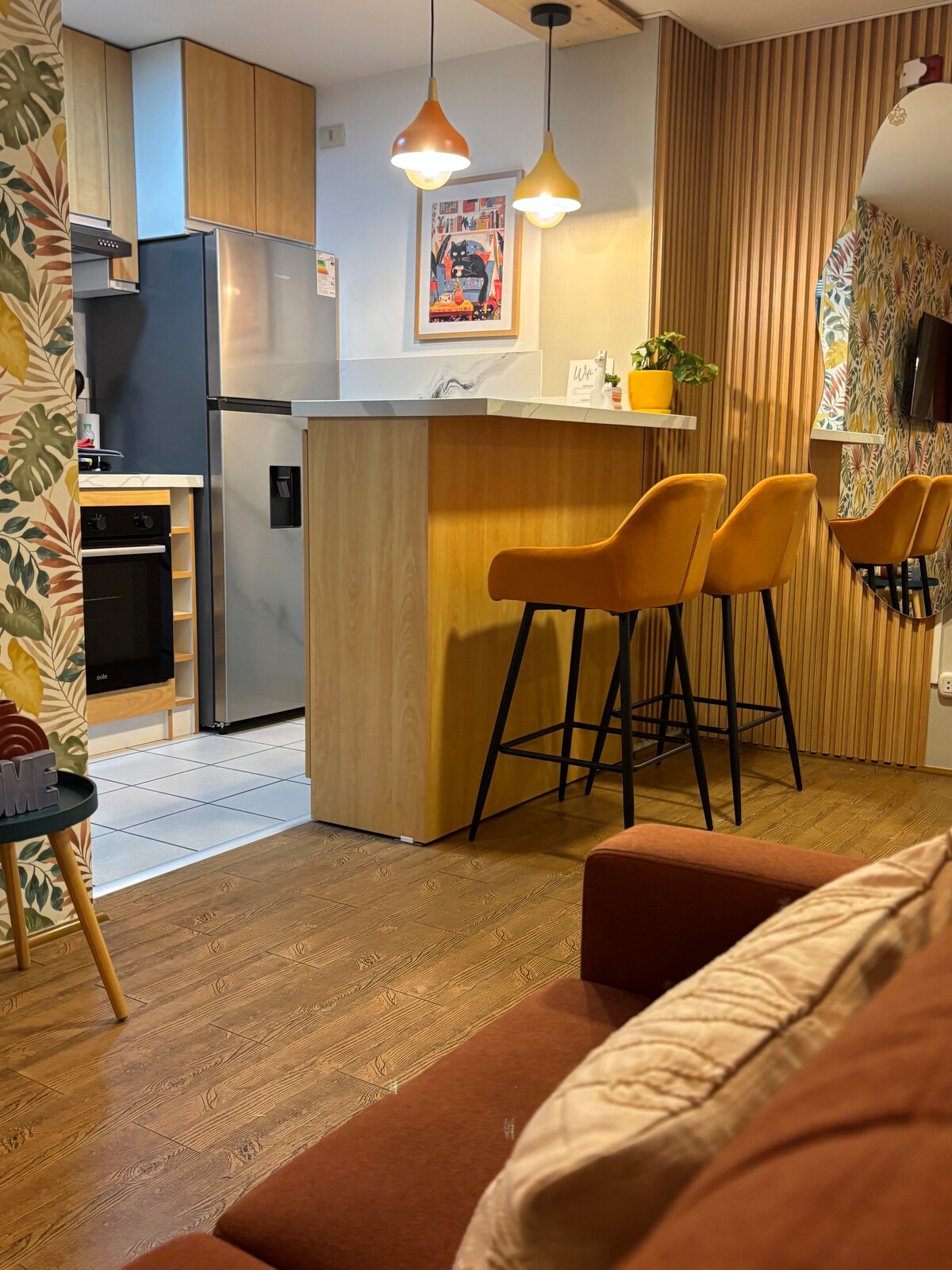 Bienvenido a tu hogar temporal. Relájate en la sala equipada con sofás ideales para ver una película en el Smart TV o disfrutar una buena charla. El comedor, con una elegante mesa para 6 personas, es perfecta para cenas en grupo o momentos especiales. Las amplias ventanas permiten que la luz natural llene el ambiente durante el día, las cortinas aseguran privacidad y calidez. El diseño del piso en madera le dan un toque moderno y hogareño. 📍Ideal para familias, parejas,amigos.