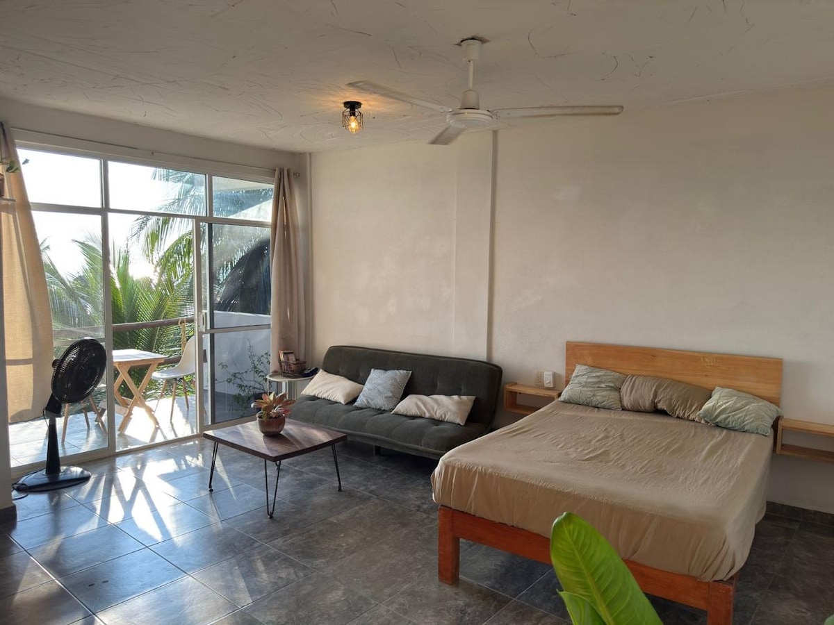 Depa amplio y luminoso en planta alta con 2 camas queen súper cómodas, A/C en la recámara y ventiladores en sala y cocina. Cuenta con cocina equipada, salita acogedora y balcón con vista a palmeras. Estás a solo 2 min de la playa y a 1 min de cafés, tiendas y restaurantes. Disfruta el patio compartido con hamacas, árboles frutales, asador y área de pesas artesanales. Ideal para relajarte, surfear o trabajar remoto con buena vibra. 🌴