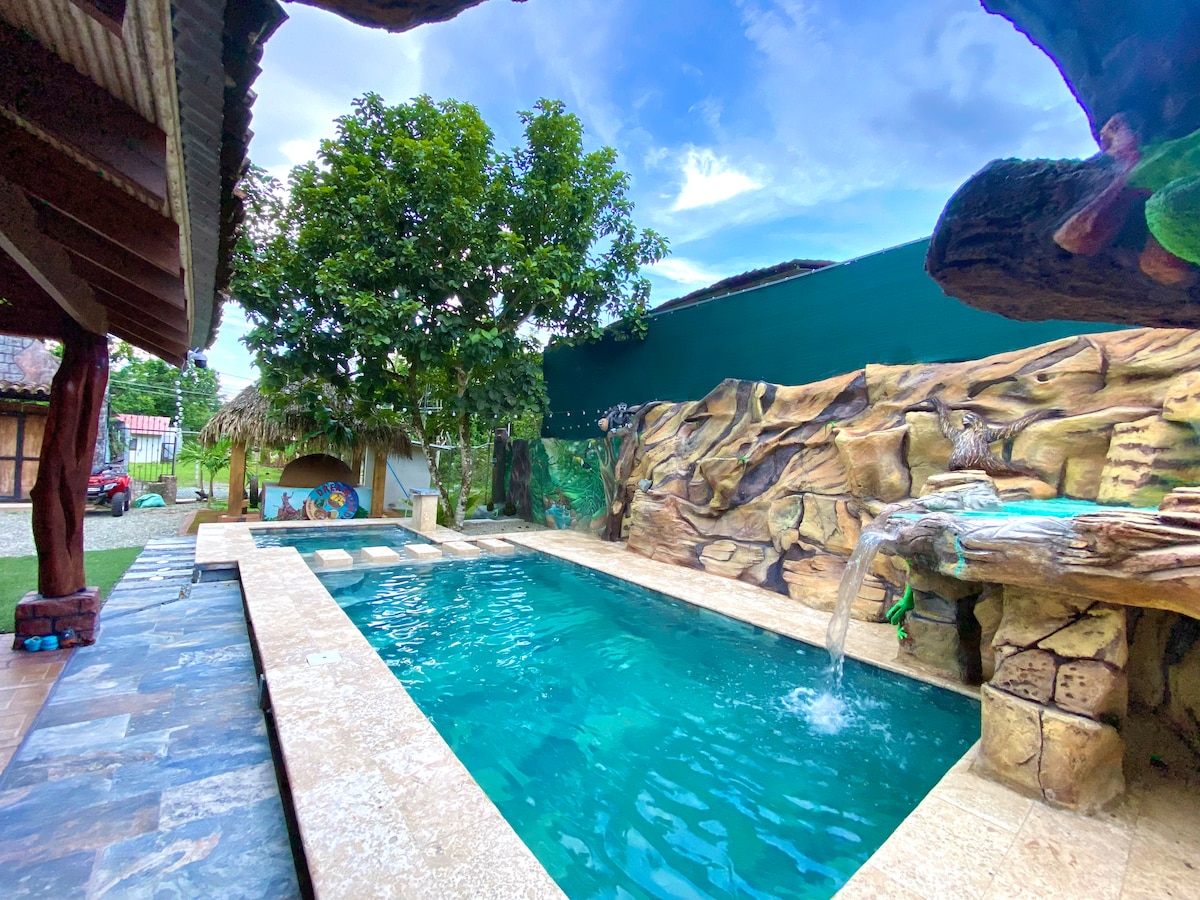 在這個獨特而寧靜的度假勝地放鬆身心。 在舒適的露台上欣賞動植物。您將會看到小鳥、蝴蝶、松鼠、猴子和綠樹枝。 花園內有各種熱帶花卉和果樹,周圍的綠意會讓您感受到非常愉悅的情緒。您可以在我們的多功能球場上打籃球或進行各種體育活動。 在房子內,您會找到您愉快入住所需的一切。