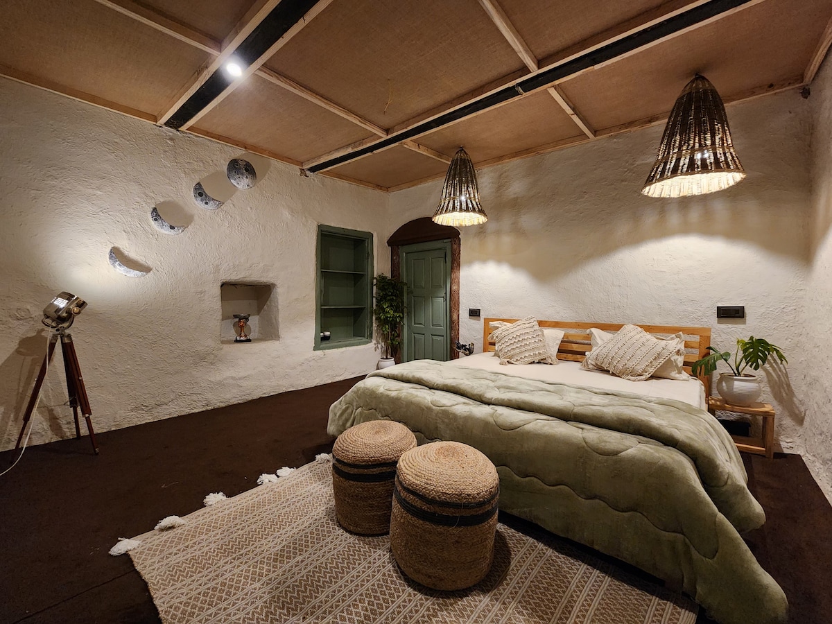Punjab Village Farm: This independent cottage is located within a beautiful farm stay, just a 90-minute drive from Amritsar city. Nestled in the picturesque countryside, the property offers an authentic experience of rural Punjab. It provides a tranquil escape from the noise of busy cities and crowded tourist spots. The cottage is designed in a traditional mud house style and features well-furnished interiors with high-quality furniture, colonial-style lighting, and modern bathroom fixtures.