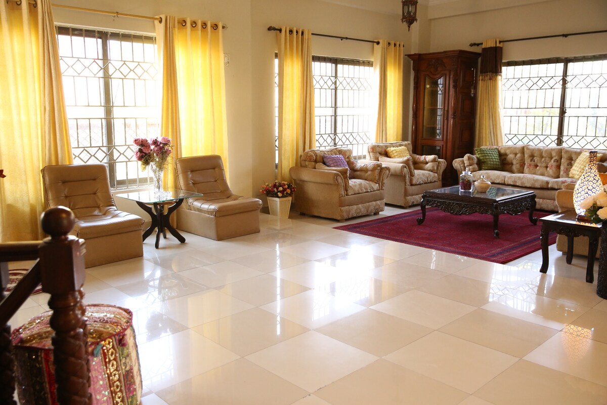 這間豪華的一臥室復古別墅採用美觀的維多利亞風格裝飾,坐落在伊斯蘭馬巴德鬱鬱蔥蔥的綠色中心,方便前往最好的購物/外出用餐場所/聯邦政府辦公室/外交飛地等。 -開車 5 分鐘即可抵達藍色區域、Kohsar市場、超市(F-6)、Aabpara、D chowk。 - 10 分鐘即可抵達真納超市(F-7)、外交區、費薩爾清真寺 - 40分鐘即可抵達機場