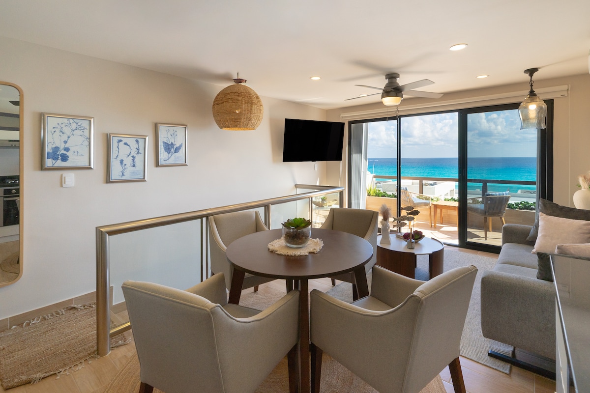 這間豪華角套房位於坎昆最美麗的海灘之一「Paraiso Azul」,配有270度陽臺,即使是從浴室也可以欣賞美妙的全景海灘線和海景。 獨特的配置,讓您在舒適的公寓露臺上體驗海灘上令人驚嘆的日出。