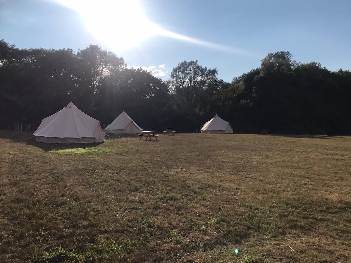 最好的豪華露營,有按摩浴缸! 我們是一個工作農場,這個度假勝地位於我們家族企業的中心 完美的鄉村度假勝地,讓您放鬆身心,重新找回自我,享受一點鄉村魅力。 我們的豪華營地坐落在山坡上,景色迷人,設有兩個舒適的鐘形帳篷和一個寬敞的穀倉,讓您享受所有共享的舒適。 在火坑旁觀星、在穀倉內打撞球或欣賞美景。 在壁爐旁喝咖啡。 在艾倫福德遠離塵囂、放鬆身心,在大自然中醒來