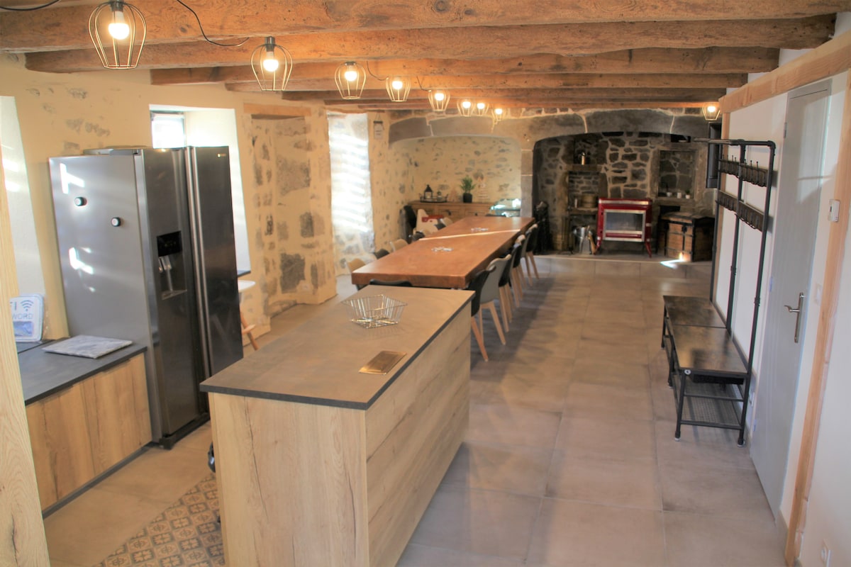 Dans un gite ( prix réduit sur une réservation à la semaine) créé dans une grange en pisé de 1850, sur 120m2 une grande pièces à vivre et à l’étage 2 grandes chambres s’ouvrant sur une terrasse de 40m2 avec vue sur le grün du Chignore, table et BBQ dans le jardin. En hiver venez vous réchauffer au bord de l'insert en rentrant de balade et en mangeant une raclette ou des crêpes. Randonnée à gogo dans le parc du Livradois Forez, lac et rivière. On aime le renouveau Val et Titi Dogfriendly