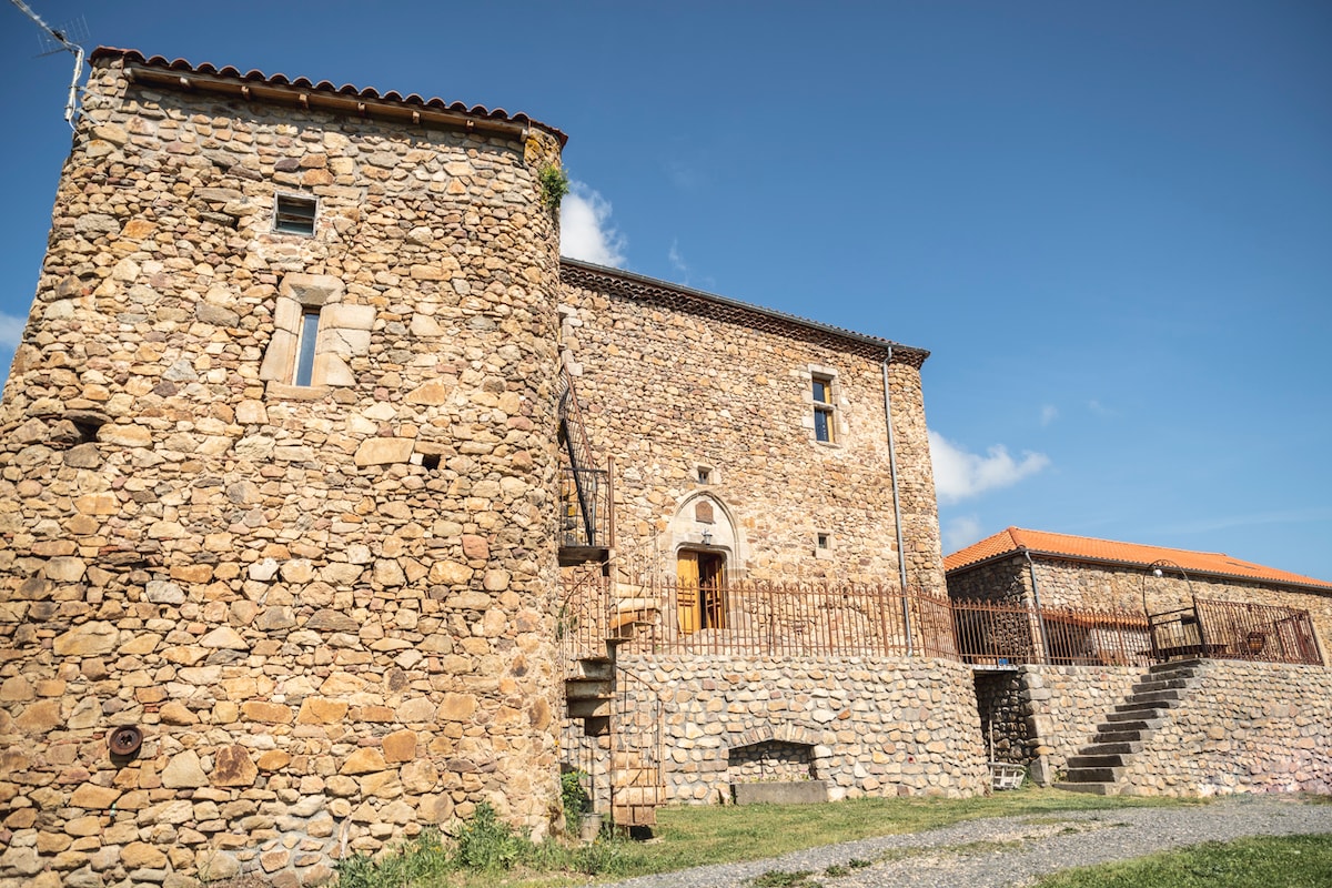 Petit château du XIVè siècle avec une tour centrale en pierre. Beaucoup de charme. Le domaine est calme et entouré d'un parc de verdure de 5000m2, à proximité de chemins de randonnées pédestres et de fôrets, il se situe à 2 mn à pied du village. Paul et Danielle, amateurs d'arts, de voyages et de nature, apprécient beaucoup les échanges avec les voyageurs et seront vous guider pour vos sorties.