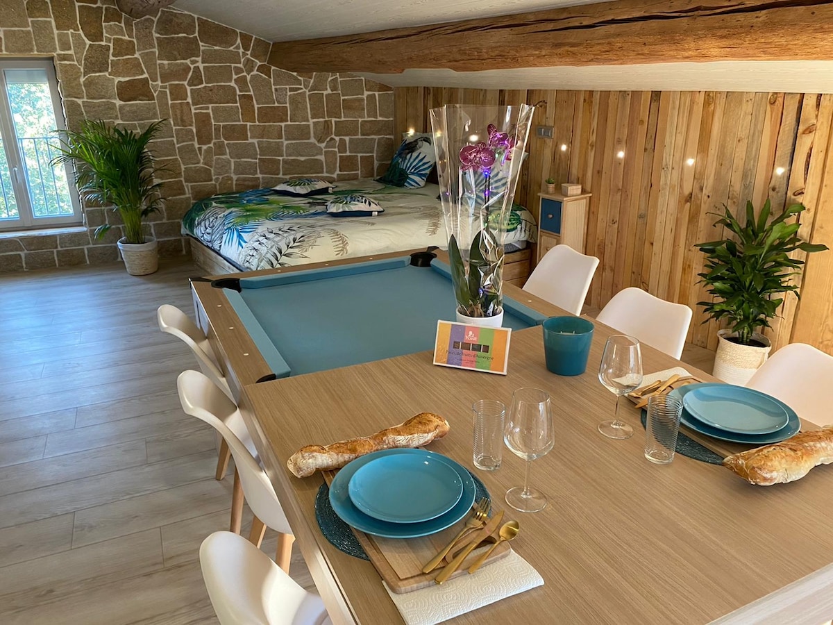 Nous vous proposons un loft de 100m² au charme rustique avec mezzanine pour 4/5 personnes. Une résidence estivale prête à vous accueillir en famille, entre amis ou en couple avec vos compagnons à quatre pattes. Nous disposons d'un jardin privatif clos. Pour les enfants nous avons à disposition une balançoire et un toboggan. Pour les petits et les grands nous avons une salle de jeux avec une table de ping-pong, baby-foot, fléchettes, punching ball et rameur. Linge de maison fourni