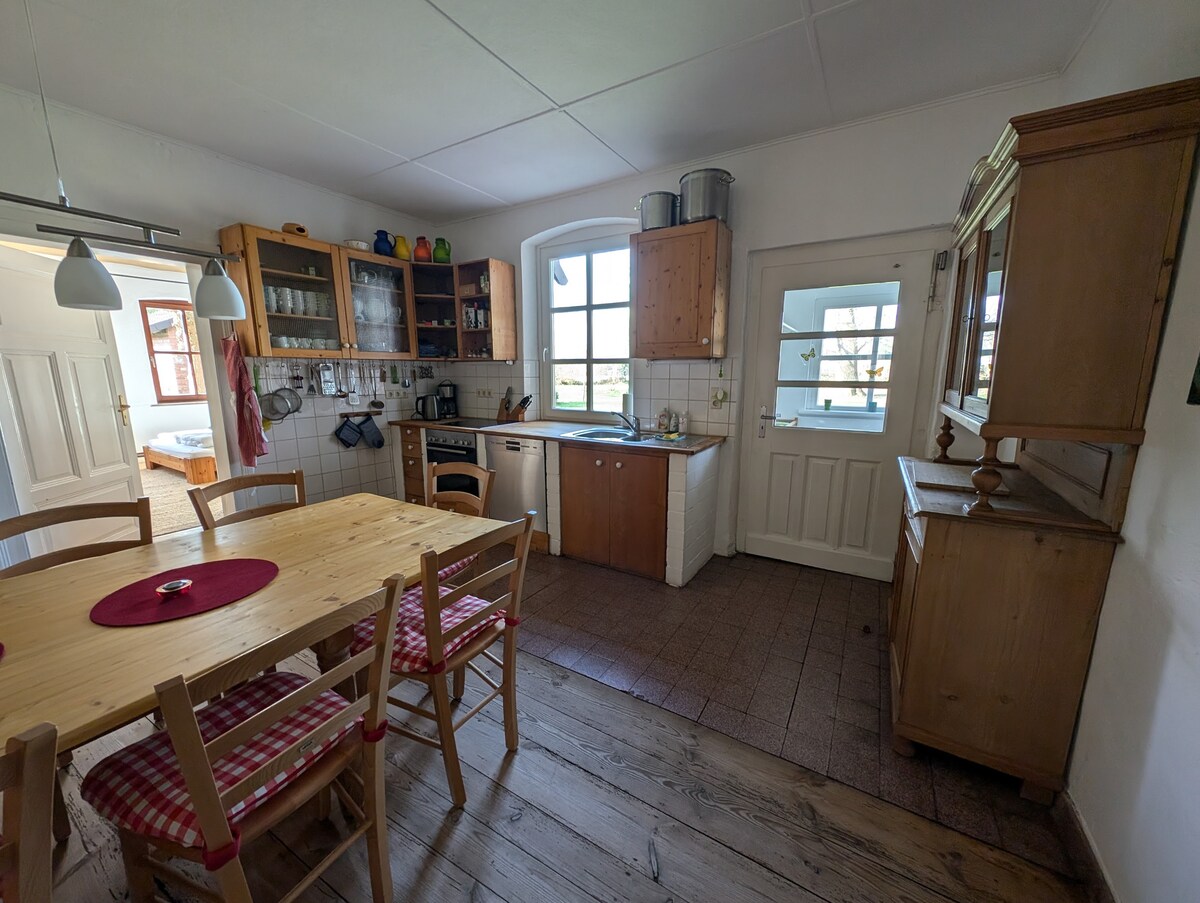 Großes ehemaliges Bauernhaus für Gruppen, Familientreffen und Kreativ-Urlaub. Das Haus steht unter Denkmalschutz. Bettwäsche/ Handtücher sollten mitgebracht werden. Ansonsten können diese auch vor Ort gemietet werden. Brennholz, Seife, Toilettenpapier, Geschirrhandtücher sind vorhanden. Die meisten Räume sind ebenerdig. Ein Schlafraum, (3 Betten) die ehemalige »Upkammer« ist 1/2 Etage höher und über eine 10stufige Treppe zu erreichen. Die Decke ist nur 175 cm hoch.