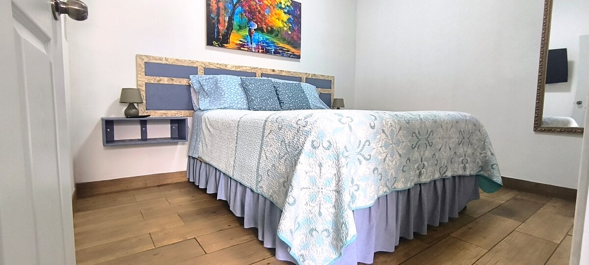 Disfruta de la comodidad de este alojamiento tranquilo e independiente, frente a Interplaza Xela. Puedes descansar o trabajar en sus ambientes en soledad o con más personas, cuenta con una cocineta equipada, comedor para 4 personas, sala (sofá cama) con entretenimientos (T.V. de 43", Wifi, Netflix y juegos de mesa) y dormitorio con una cama king size, escritorio, closet y un cómodo baño con agua caliente. Estacionamiento gratuito seguro y hasta 4 vehículos.