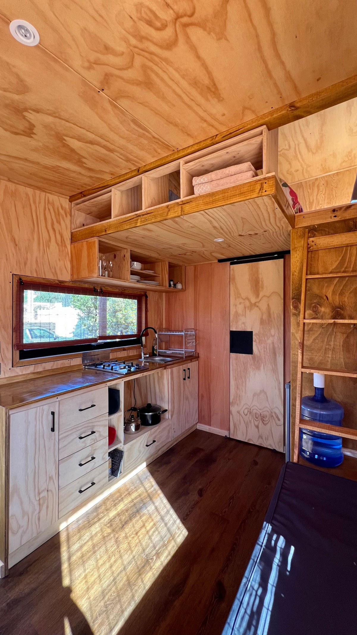美麗的輪子小屋(迷你屋) ,位於海灘線上,距離手工藝博覽會僅幾步之遙。 Tiny設有一間閣樓臥室,配有窗戶和2座牀墊、瓦斯爐、冰箱、熱水淋浴間、傳統馬桶和太陽能電池板電力。 木製露臺,配有遮蔭和長凳,可坐下來,露臺配有爐具。 非常舒適,適合2人、情侶或朋友@ s !