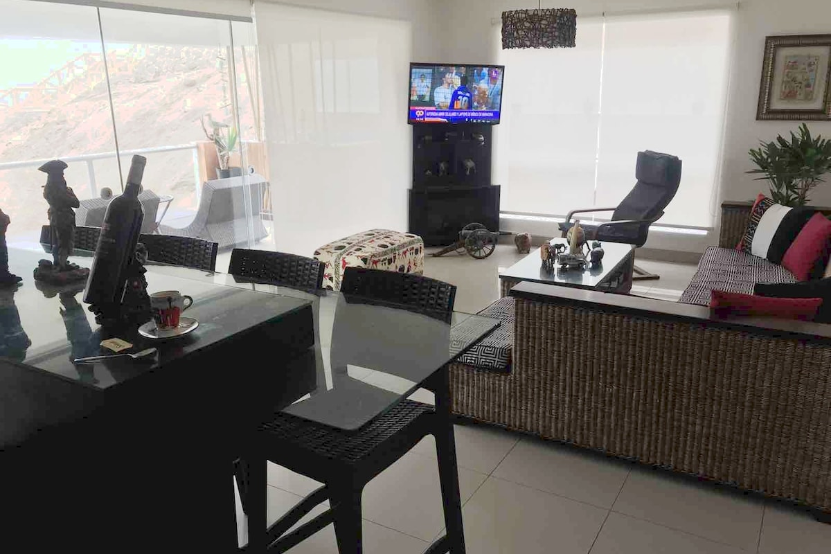位置優越的華麗公寓。我們擁有整個海灘的最佳位置。令人驚嘆的景觀,獨一無二。距離海岸1步之遙。 最近剛整修完畢。泳池功能齊全,清澈見底。不斷維護和保護得很好。 距離時尚的亞洲大道15分鐘路程。距離Cerro Azul村10分鐘路程。 您將在太平洋沿岸體驗難忘的日落。有時候,您還可以看到秘魯海豚!
