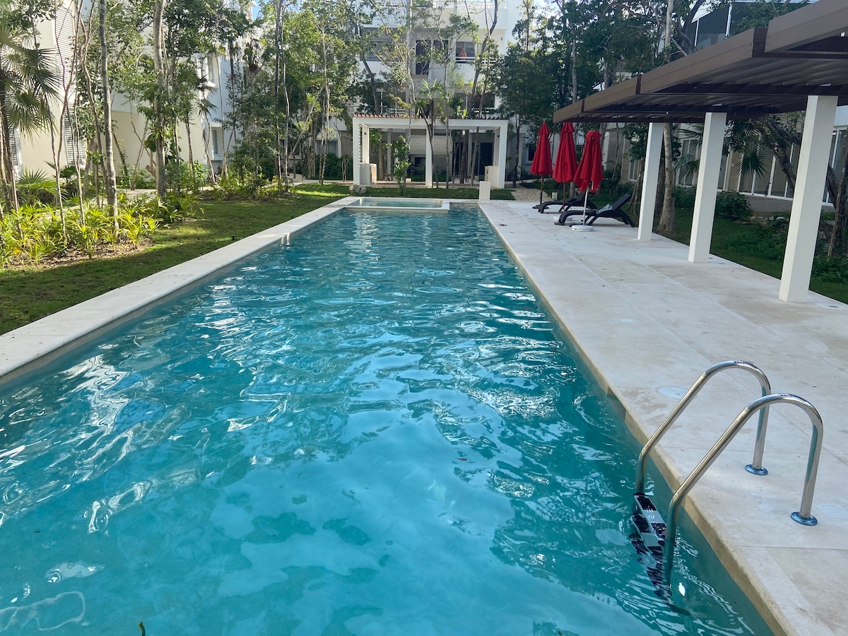 這套超棒的公寓位於安全區域,距離海邊和著名的第五大道 (5th Avenue) 只有幾步之遙,非常適合喜歡優質生活方式的人。 私人露臺,配有按摩浴缸,可俯瞰熱帶花園、免費WIFI和私人停車場。 Aluxeshome有一間寬敞的離開房間,配有沙發牀、一間臥室、兩間衛浴和一間廚房。 電梯和保安。 靠近當地最好的海灘俱樂部、餐廳、咖啡廳、商店、藝術和音樂。 乘坐ADO巴士、計程車或汽車可輕鬆抵達。