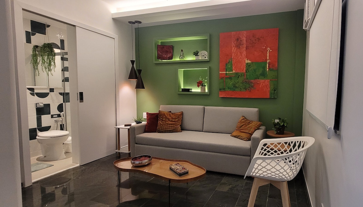 在這個位於世界上最著名的海灘COPACABANA的街區的好地方享受優雅的住宿。(介於3號站和4號站之間)。公寓有1間大臥室,配有舒適的雙人床和1張沙發床、50英寸電視、內置衣櫃、大鏡子、書桌、直接和間接照明、配有爐子、冰箱、微波爐、咖啡機和所有餐具的廚房。全套浴室和一個極佳的淋浴。兩個房間都有空調。大樓有 24 小時門衛。