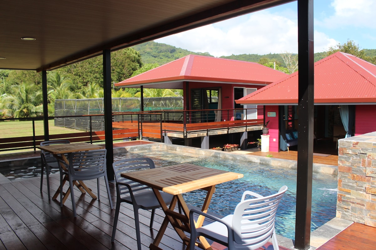 Avec une vue exceptionnelle, notre Fare Maupiti ( 2 pièces) avec coin cuisine séparée de la chambre, lit en 160/200 cm, salle de bains avec douche italienne et wc privatif. Pour des raisons de sécurité et pour la tranquillité de nos hôtes, nous n’acceptons pas les enfants ni de bébé. Notre petite piscine sera partagée avec 2 autres hôtes. Elle sera là pour vous détendre en fin de journée, avec une vue imprenable . Transferts sur demande et repas du soir ou pizzas assuré par un traiteur 7j/7