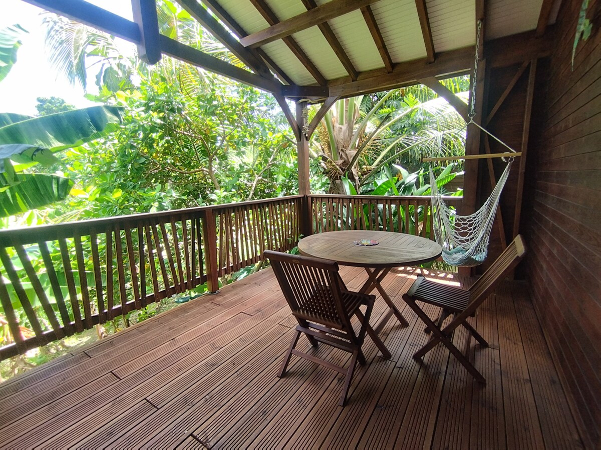 Charmant bungalow en bois, classé 3 étoiles ( pour 2 personnes mais pouvant accueillir jusqu'à 4 personnes) situé à proximité immédiate du bord de mer et de ses plages. Il a été construit dans l'esprit "cabane" et il se situe dans un endroit bien ventilé à l'entrée de notre jardin. Vous profiterez au réveil du lever de soleil sur la terrasse. Au coucher, vous serez enivrer par le parfum d'Ylang Ylang et bercer par le chant des grenouilles.