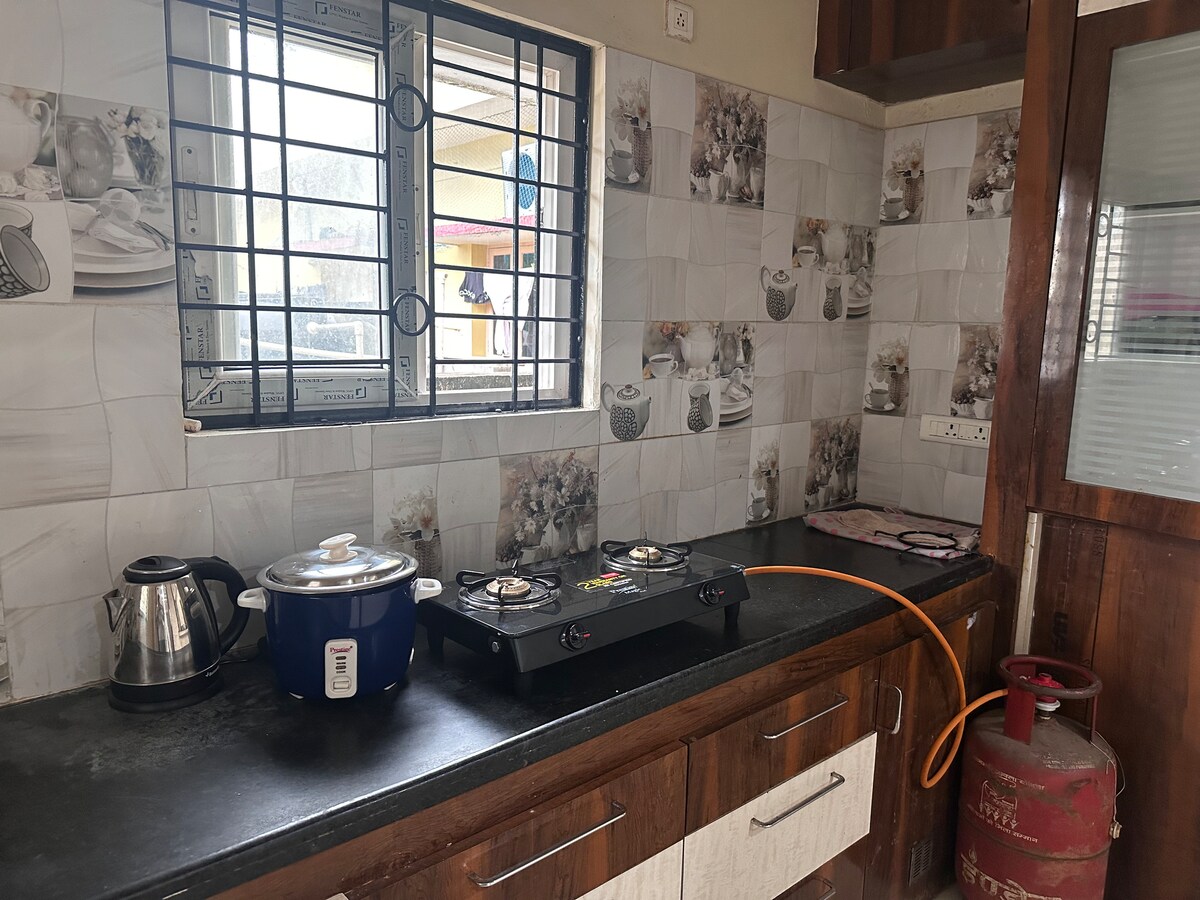歡迎來到您的私人高級度假勝地,在此獨特而寧靜的度假勝地放鬆身心。 這間精心設計的1BHK公寓旨在提供舒適、隱私和奢華的感受,讓它成為尋求寧靜和時尚住宿的情侶的理想度假勝地。 公寓設有寬敞的臥室,配有舒適的床和安靜的室內裝潢,讓您在漫長的一天後放鬆身心。 起居區溫馨而優雅。 現代化的廚房設備齊全,可供烹飪。