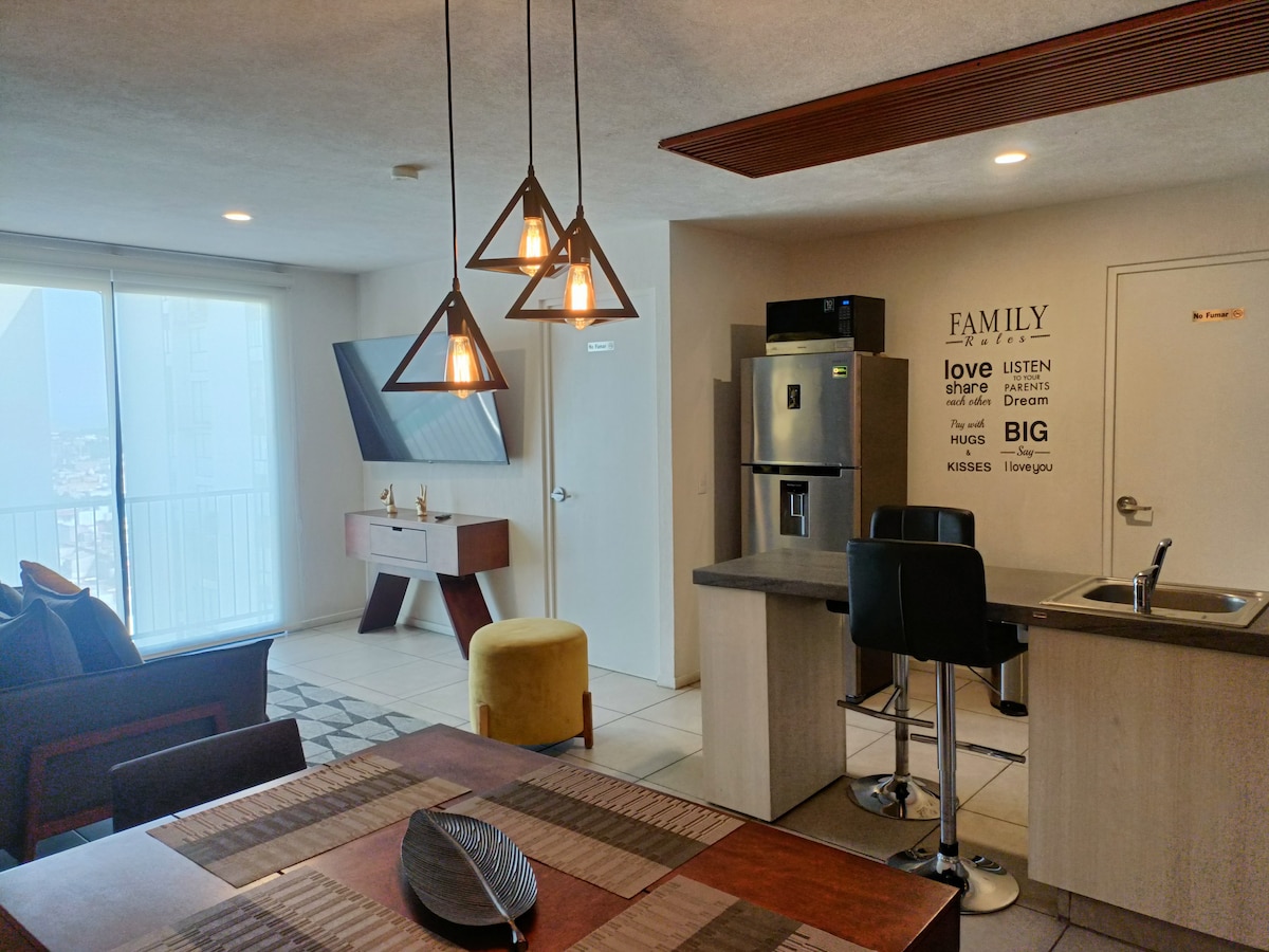 舒適、乾淨、位於市中心,可欣賞壯麗的城市景觀。 客廳和主臥室有空調。 娛樂泳池(其運營可能會因清潔或維修而無法使用,恕不另行通知,請檢查可用性)、健身房和兒童區。 接待大廳。安全和停車。 靠近Paseo Alcalde和輕軌。 我們熱切期待您的光臨,並分享為房客休息準備的空間。