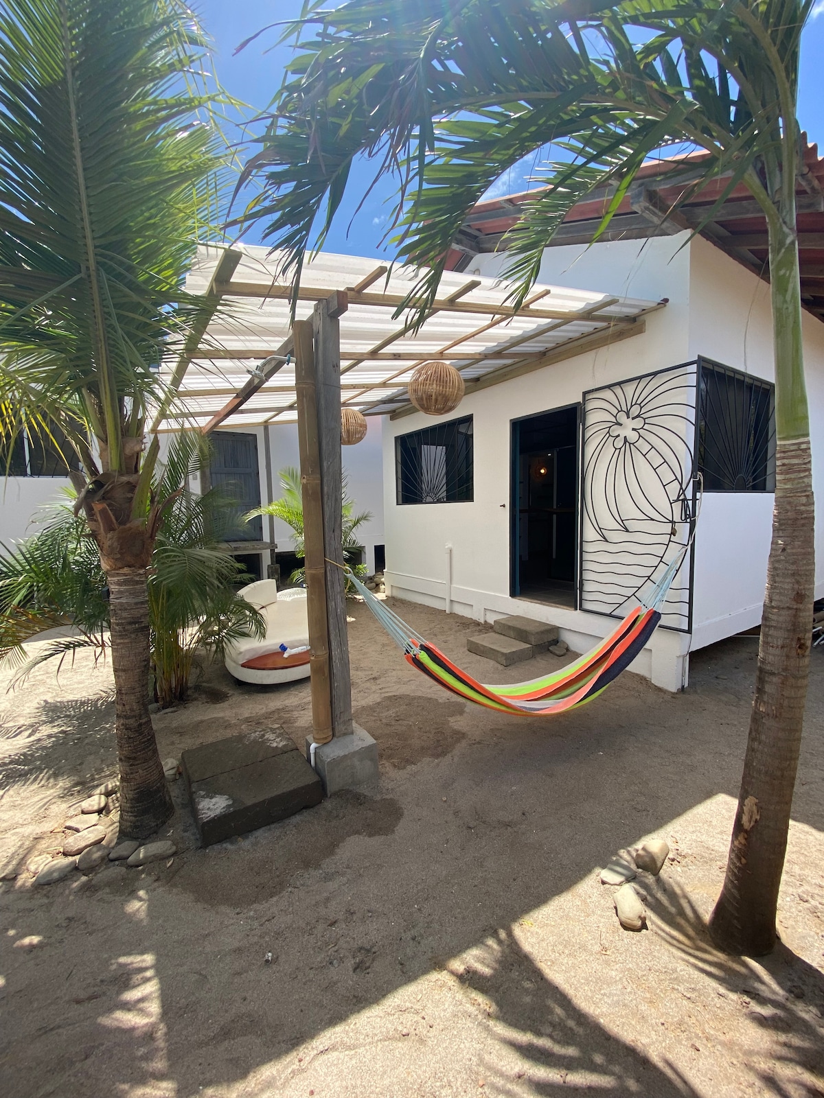 您的環保家園。沉浸在真正的生態新建2層別墅中。自然微風和光線、私人露臺安靜且安全。自然舒適,別墅座落在距離海灘僅150公尺的茂密花園中,配有WiFi、廚房、客廳和一個美麗的大浴室,擁有獨特的建築設計,包括圓形牆壁和拱形窗戶。牆壁由天然資源製成,如土壤,屋頂覆蓋著傳統的尼加拉瓜「牧場風格」。