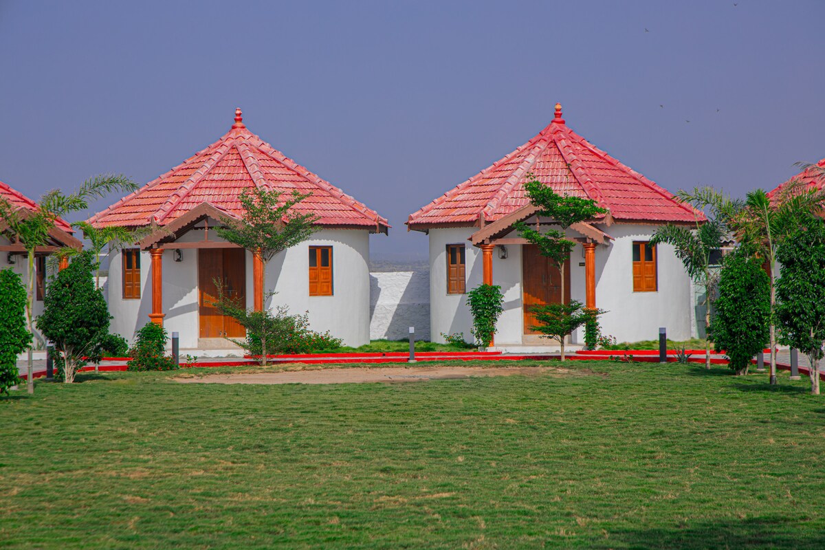 美麗農舍的可愛房間,周圍有田野,遠離Bhuj市的喧囂。距離Madhapar鎮僅10分鐘車程,因此必須有車才能通勤。獨特的房屋由當地黃石、手工屋瓦和美麗的日落景觀建造而成。 共用空間包括游泳池、客廳和一個有兒童遊樂區的庭院。 在這個寧靜的住處與家人一起放鬆身心。