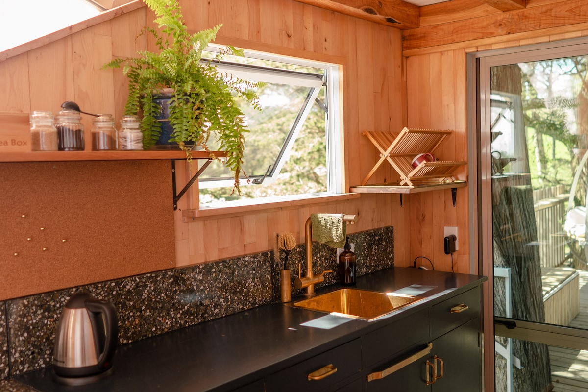 嗨,我是Edward!查看我們的insta @ ecoescape ,了解更多相片+資訊!這個度假屋是一個2部分的微型房屋,坐落在塔拉納基山腳下,擁有無與倫比的山景。距離城鎮和海灘15分鐘,距離山脈和自行車道一步之遙,這個獨立的微型房屋是那些希望參觀塔拉納基山冒險或放鬆的人的完美之地。此房源由太陽能板和水力渦輪機提供動力,是「離網」的地方。 期待您的入住!