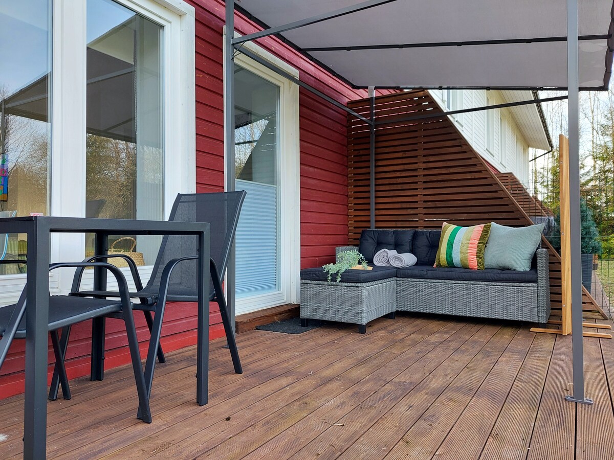 距離塔林 30 分鐘車程的森林房源,擁有大型私人花園。 房子內有電桑拿(最多6小時,包含在房子價格內)、熱水浴缸(+50歐元)和室外燃木全景桑拿(+ 30歐元)。在大露臺上有2張日光浴躺椅和室外家具,房客還可以使用烤肉架。 空調、淋浴間/桑拿房的地暖和客廳的室內壁爐