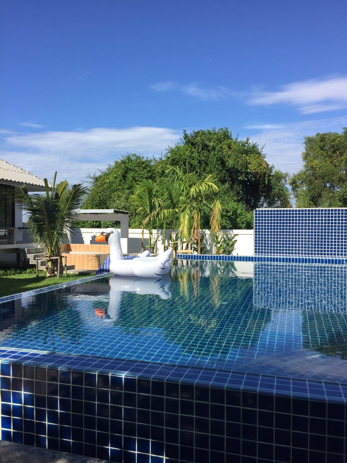 ตกแต่งเป็นที่พักตากอากาศ มีสวน สระว่ายน้ำ ครัวขนาดเล็ก