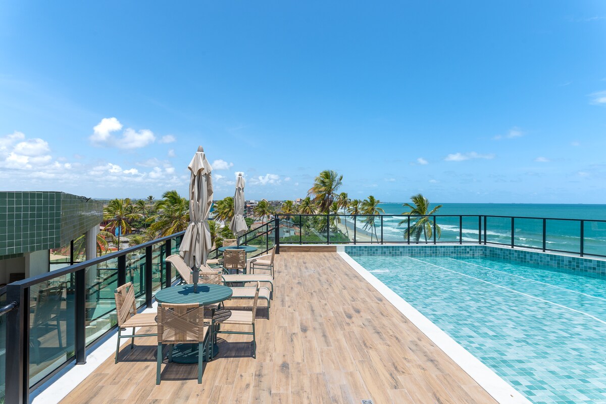 - >完整的嫁妝(床和浴室)。- > 24小時房東服務。 ☆私人泳池,可欣賞海景。- > 24小時禮賓服務。- >免費室內停車位,來盡情享受Porto de Galinhas! 海濱公寓,有極佳的休閒區域,以及公寓的獨家泳池。 公寓設有完整的休閒區域,如屋頂,設有燒烤、泳池和陽傘,以及海灘全景。