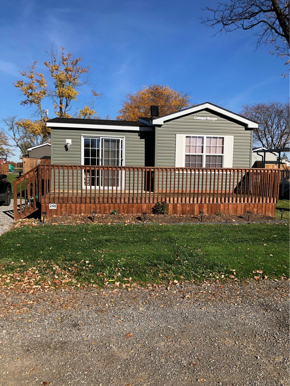 這輛拖車配有日光浴室,全新翻新,包括高爾夫球車。坐落在伊利湖邊緣的安靜二排街道上。 升級包括:部分覆蓋、500平方英尺、複合甲板,配有戶外用餐和休息區;擴展的廚房、洗衣機、地板、浴室和室內設計將滿足您的需求。 雙層床和拉出式沙發將滿足您的睡眠需求,讓您舒適入住。