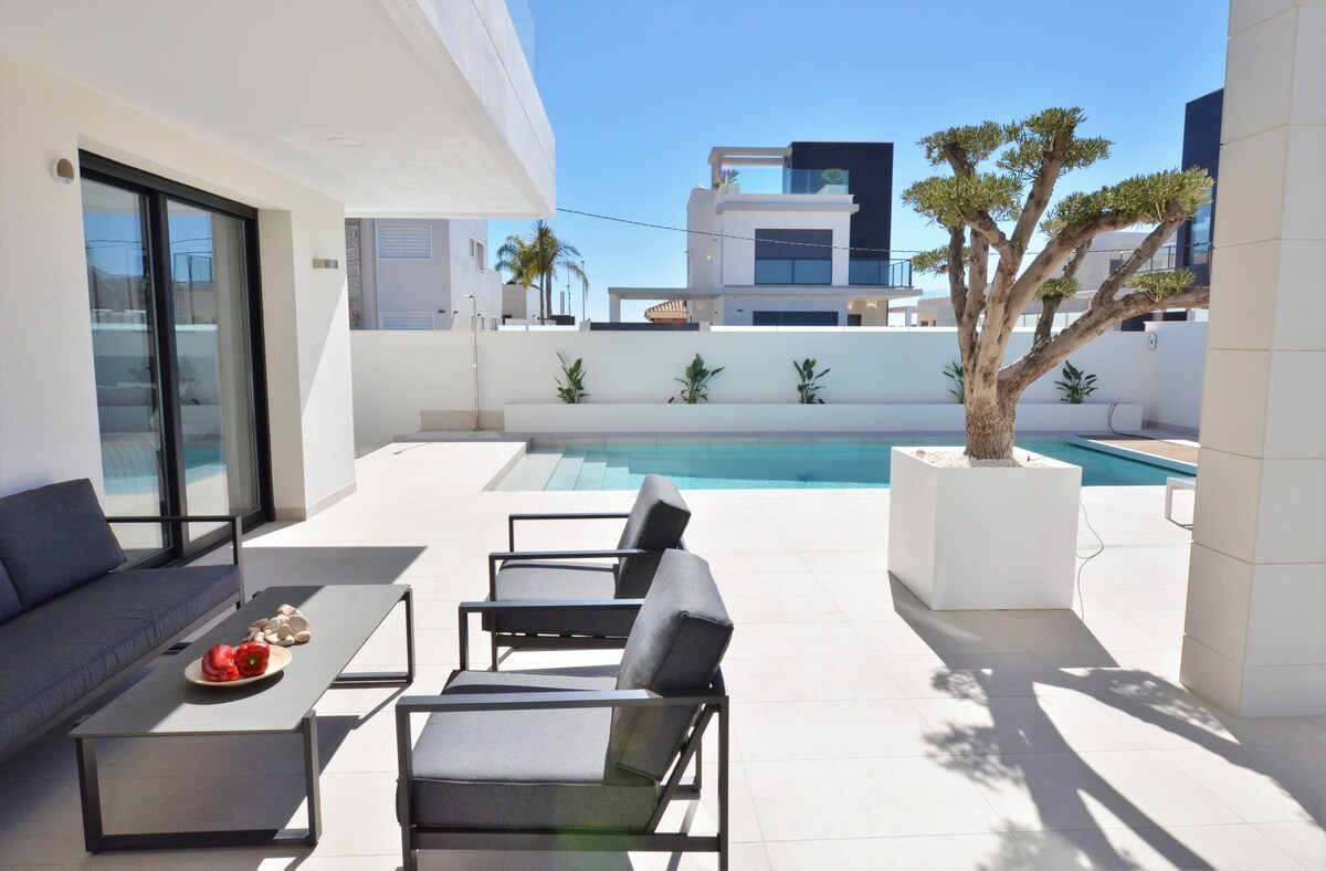 高爾夫球場、海灘、酒吧、餐廳、大城市或安靜的放鬆。 帶上您的家人或朋友,享受這個優雅的住宿。 全新的豪華別墅配備多種設備與服務。 私人花園和泳池區域,有各種休息區域、日光浴牀和燒烤,非常適合在戶外放鬆身心。 您可以在三層樓上嬉戲,有一個大型屋頂露臺,在那裡您可以欣賞城市的風景和大海。 空調和高速網路。 我們提供3張雙人牀160 * 200和4張單人牀90 * 200。