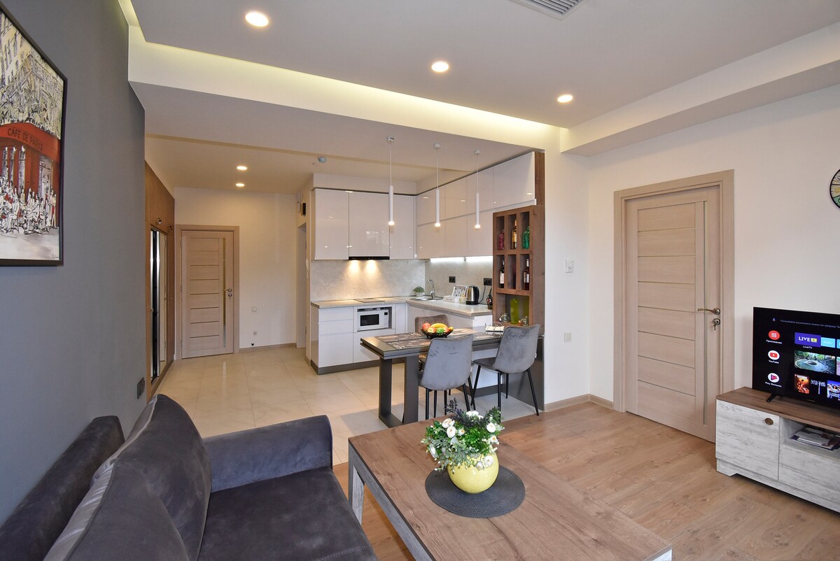 距離共和廣場2分鐘路程。豪華頂樓 1 間臥室,可欣賞絕美全景。享受現代室內裝潢、55 吋電視、IPTV、Wi-Fi 和最先進的電器,包括全年舒適的地暖。步行即可抵達超市、外幣兌換所、藥局、披薩店、深夜美食和遊戲商店,以及夜生活的天空酒吧。前面就有公園,頂層兩層有專屬電梯,確保隱私,無需等待。極致便利的奢華生活!