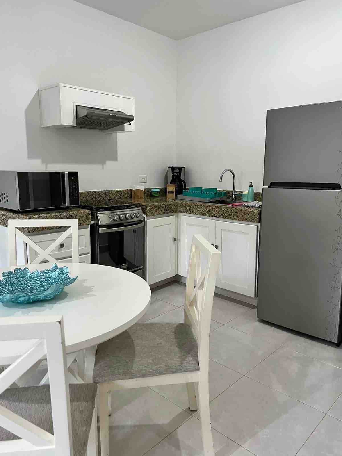 Departamento planta baja, 2 habitaciones, totalmente amueblado y equipado. Diseñado para viajeros de negocios o vacaciones: espacios funcionales de trabajo, aire acondicionado y Wi‑Fi de alta velocidad por fibra óptica. Entorno tranquilo y cercano al mar. Amenidades: alberca semiolímpica, palapas y camastros, y rooftop con vistas panorámicas al océano. Ideal para estancias corporativas o mixtas.