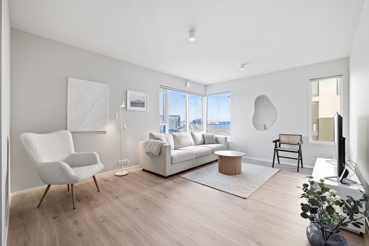 NEW listing! Enjoy a spacious, modern apartment — perfect for families or small groups. The master bedroom doubles as a private studio with its own bathroom, walk-in closet, kitchenette, and direct balcony access. • Sleeps up to 6 guests: 2 double beds + 2 single sofa beds • 30-minute walk to downtown Reykjavík • Breathtaking ocean view ✔ Great for families & groups ✔ Wi-Fi, Smart TV & free parking ✔ Self-check-in ✔ Paid parking cellar – free for our guests