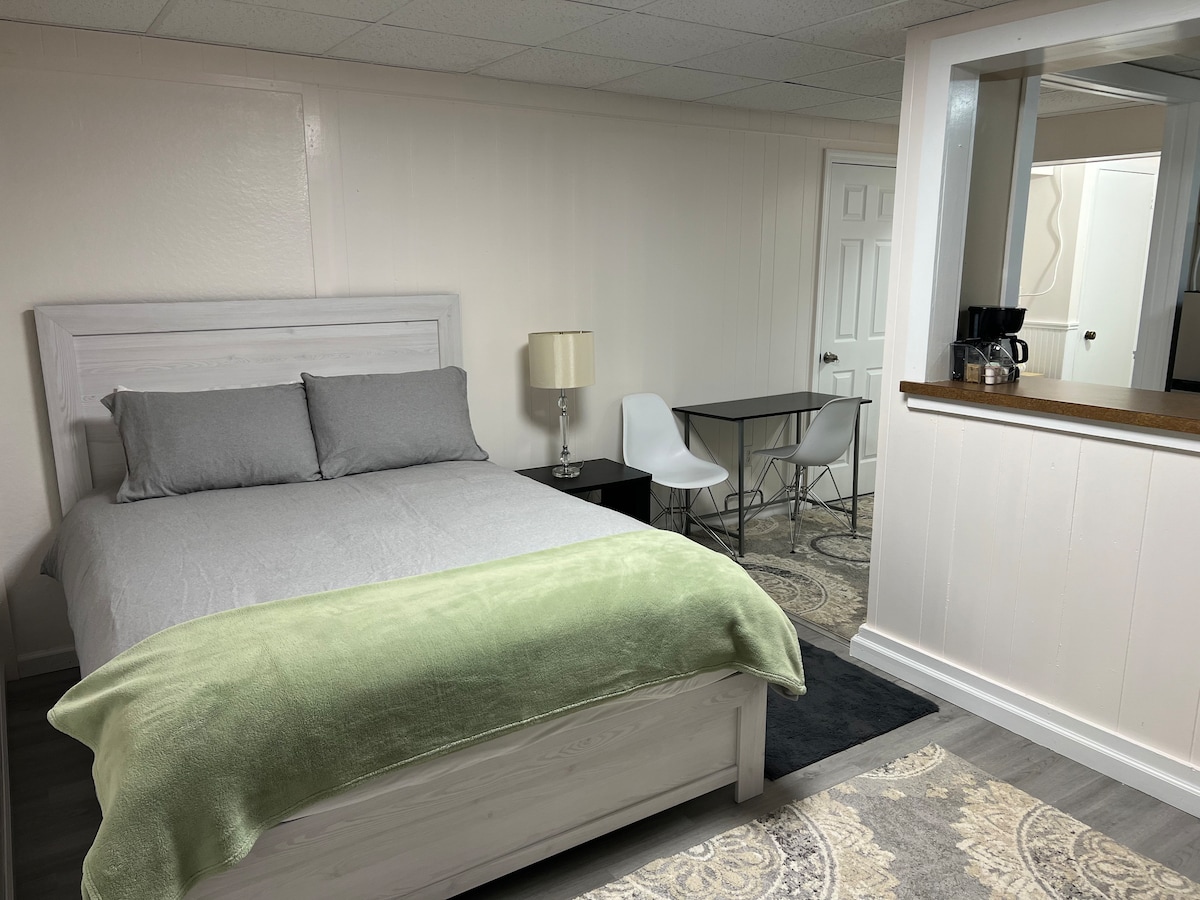 Welcome to our blue apartment a Peaceful, comfy one bedroom apartment suitable for 4 people. Private bedroom has a Queen size bed with comfy mattress and two small closets to keep your belongs. Living room has two twin comfy beds, tv and desk. Kitchenette is equipped with necessities for a quick meal and coffee maker. You can also enjoy the shared backyard with the fire pit. Keep in mind if you stay past our check out time you will be charge an extra night.