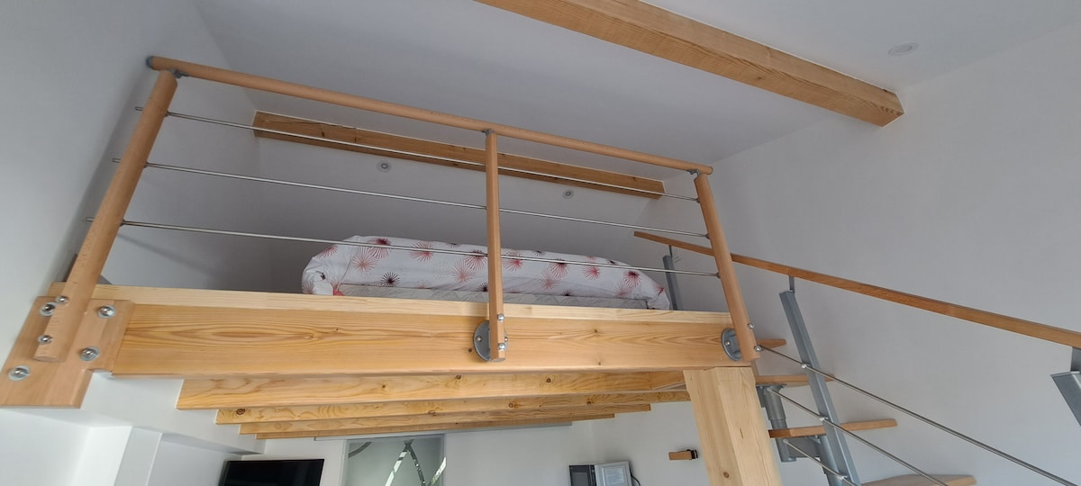 Studio indépendant dans petite propriété avec arrivée autonome. Équipements: Micro-ondes, Tassimo, bouilloire, frigo, WiFi, climatisation... Le couchage est en mezzanine mansardée, dotée d'un lit 2 places avec literie de qualité. Cet espace nuit de 6,2 m² a une hauteur au plus haut de 1.3 m, il faudra se baisser. Idéalement situé: - 10 mn à pied du centre d'examen de la gendarmerie - Gare de Sathonay à 500 m, (Part-Dieu en 8 mn) - Arrêt de bus ligne 9 à 600m, (35 mn du centre-ville de Lyon)