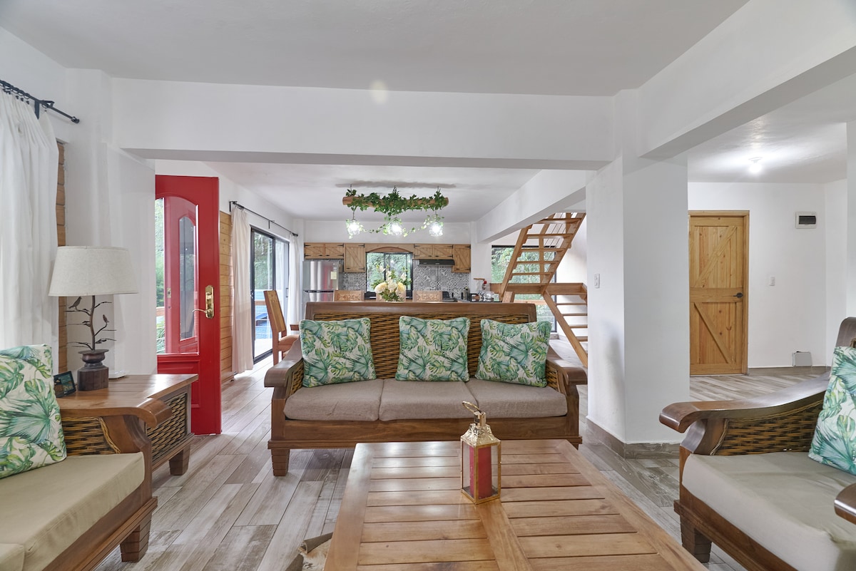 Escape to Cassalena Ecolodge, a mountain sanctuary in Jarabacoa. Relax in your private heated jacuzzi or cook in the beautiful outdoor kitchen and dining area. This exclusive retreat features an open-concept living room that flows into nature, a Master suite with a King bed, and a comfortable sofa bed for extra guests. With AC, 3 Smart TVs, and fast Wi-Fi for remote work, it’s the perfect balance of luxury and peace for couples or small families seeking a unique getaway.