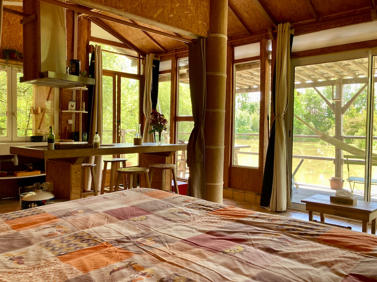 Cabane de charme tout confort, terrasse sur étang