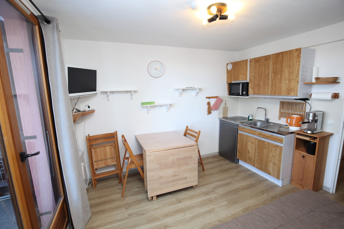 坐落在度假村中心的舒適明亮的朝南單間公寓。 可欣賞山脈和火車站的美景。 如無必要,不收取清潔費。 提供床單,無需額外收費。 距離滑雪/電梯腳步 100 公尺。 從健行、山地自行車、砂石路和小徑路線開始。 距離塞爾蓬松湖(Lac de Serre-Ponçon)25分鐘路程。 兒童遊戲、高海拔/山腳的酒吧/餐廳、超市、水療、煙草/報刊、日託(視開放期間而定)。 在4樓,步行爬樓。