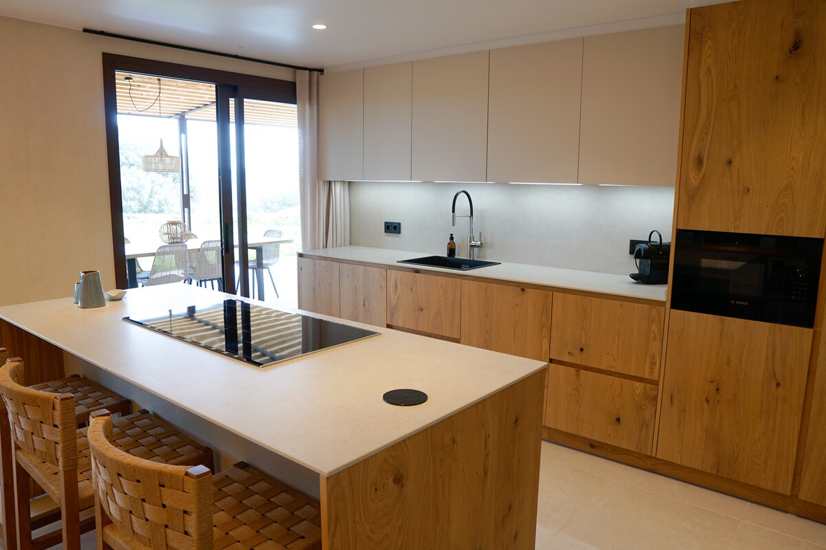 Mas Prats becomes a quiet corner, which invites you to rest and enjoy a unique rural environment located between the Costa Brava and the Gavarres. The one-story house is accessible, spacious and very bright and from every room you can see the fields or the forest. The birds are listening. Two large windows connect the house to the outside, where the porch invites you to enjoy the landscape. The decoration is minimalist and they dominate the clear tones and the wood. An ideal choice for any time of the year.