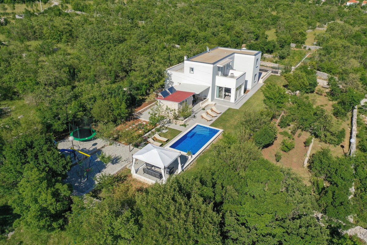 這座建於2022年6月的全新房屋令人愉悅!可容納5人,提供25平方公尺的泳池和按摩浴缸。您可以在外面的露臺上炫耀您的烤肉技巧;或在屋內向世界展示您在PS5上玩FIFA的技巧。在雨夜,我們建議您使用Netflix ,在65英寸電視上放鬆。位於安靜的街區,距離斯普利特的喧囂20分鐘車程。準備好成為我們的第一批房客了嗎?