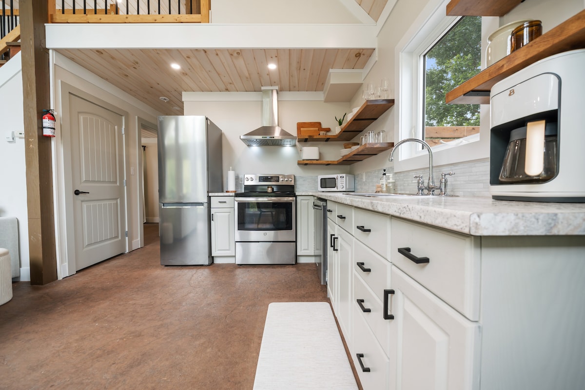 「Kenzie B」小屋是新建的小屋,具有獨特的特色,如滑動鋼製穀倉門、鋼製淋浴間和天花板上的舊穀倉樑。 小屋前面的有蓋陽臺可欣賞潮汐河的美景,私人按摩浴池也可俯瞰河景。 游泳、划船、漂浮,無論您想要什麼,河流都在等著您! 如果您想進一步探索河流,我們還有一張機動浮動野餐桌可供出租。