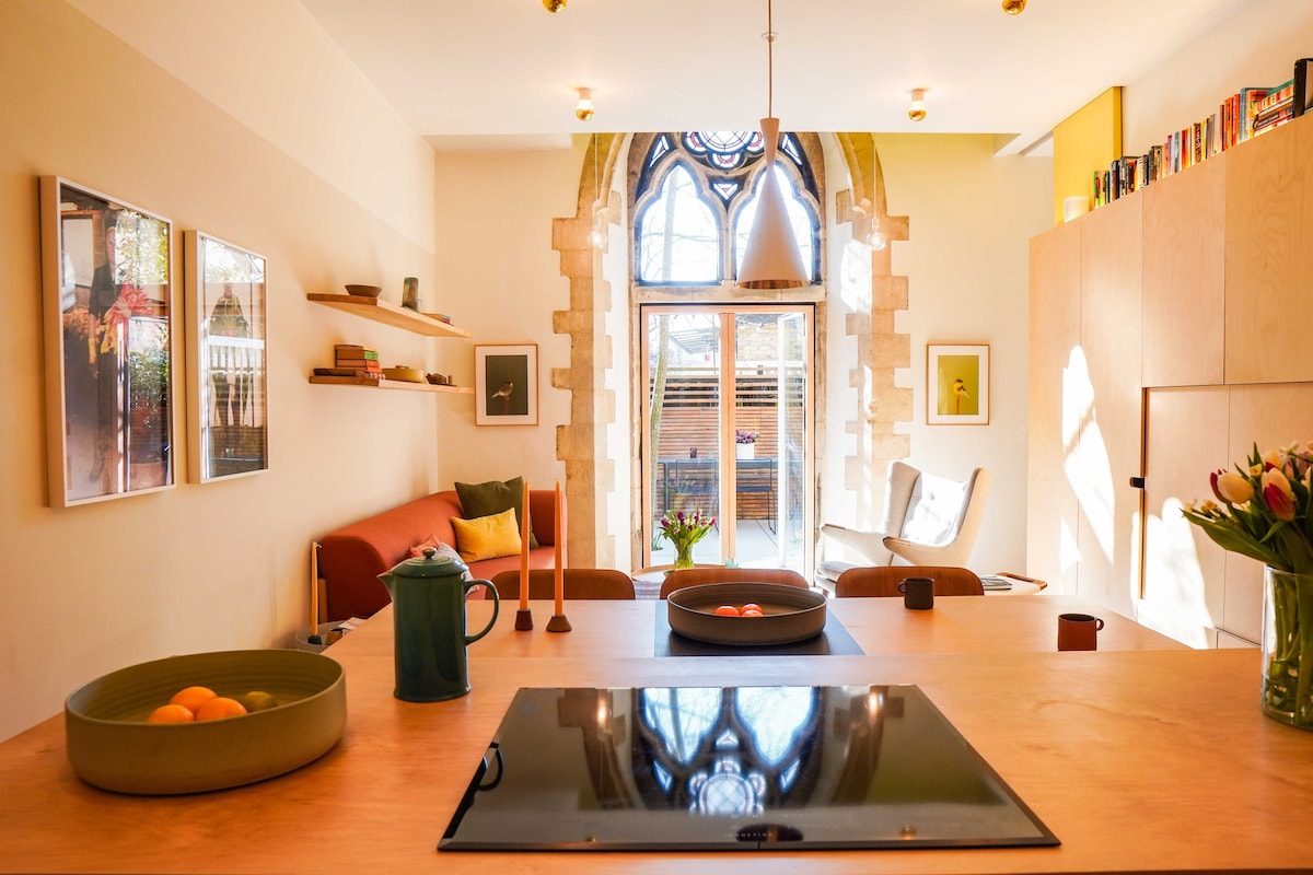 歡迎來到這個非凡的現代花園公寓,巧妙地設計在前教堂的歷史墻壁內。 ★ 令人驚嘆的建築師設計的公寓 非常★ 適合尋找時尚度假勝地的單身、情侶和商務差旅人士,距離市中心15分鐘路程。 ★ 豪華加大雙人床,配有舒適的Tempur床墊 配備烤肉架的★私人花園 ★ 位於一個安靜的綠樹成蔭的街區,交通便利。 1 輛車的★免費庭院停車位